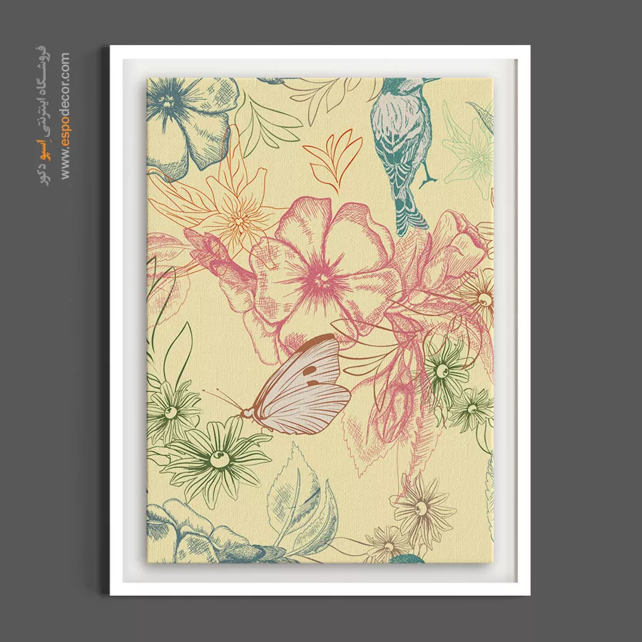 این اثر هنری با بهرهگیری از تکنیک تصویرسازی خطی و ظریف مجموعهای از گلهای صحرایی پروانه و پرندگان کوچک را در قالبی کلاسیک به تصویر میکشد و با پالت رنگی شامل صورتی چرک و سبز سدری بر روی پسزمینه لیمویی ملایم اتمسفری سرشار از آرامش و نوستالژی را به فضا تزریق میکند که به دلیل ماهیت الگوگونه و مینیمال خود انتخابی هوشمندانه برای تلطیف دکوراسیون اتاق خواب و فضاهای مطالعه محسوب میشود.