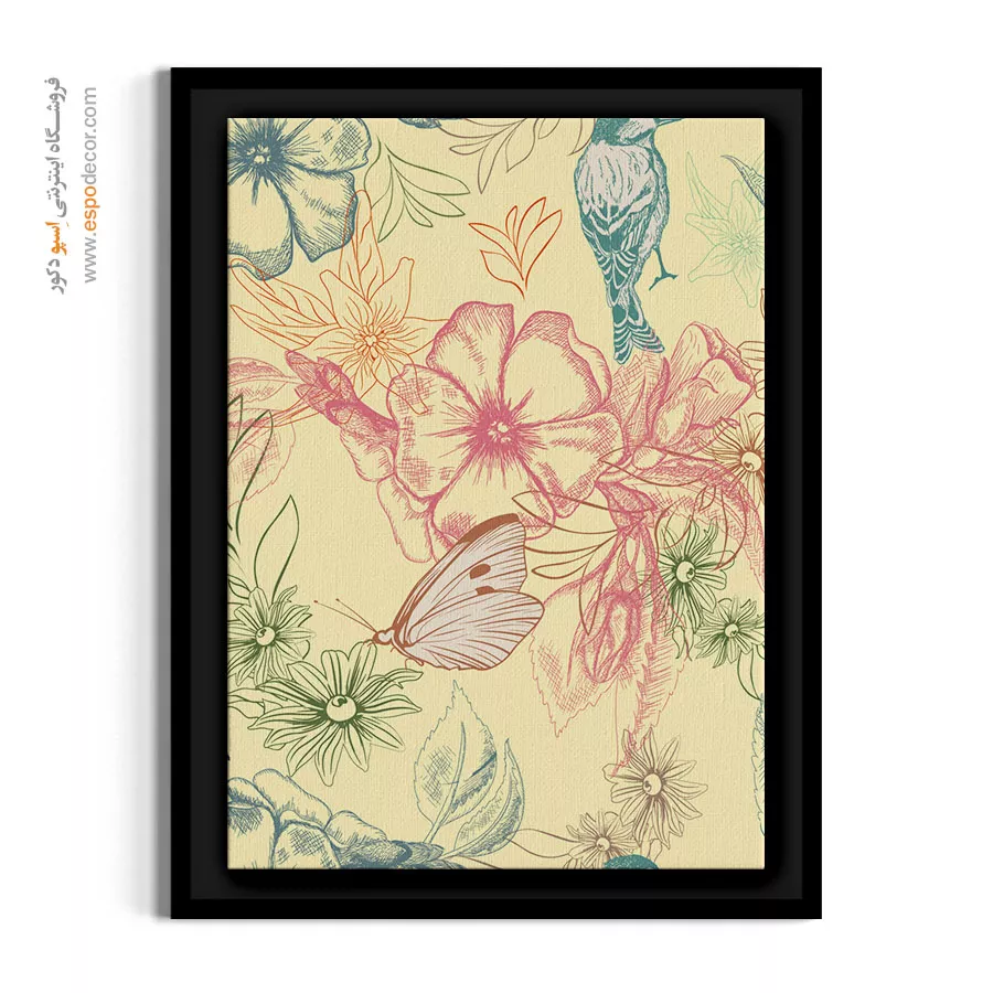 این اثر هنری با بهرهگیری از تکنیک تصویرسازیِ خطی و ظریف، مجموعهای از گلهای صحرایی، پروانه و پرندگان کوچک را در قالبی کلاسیک و الگوگونه به تصویر میکشد. پالت رنگیِ شامل صورتی چرک و سبز سدری بر روی پسزمینهی لیموییِ ملایم، اتمسفری سرشار از آرامش، نوستالژی و لطافت را به فضا تزریق میکند. تکرارِ موزونِ المانهای طبیعی، حسی از نظم و زیباییِ بیانتها را القا مینماید. بافت طبیعی پارچه بوم نقاشی به این طرحِ پاستلی عمق بخشیده و سطح مات بوم مانع از ایجاد بازتاب نور میشود تا جزئیاتِ ظریفِ خطی در تمام ساعات روز دیده شوند.
