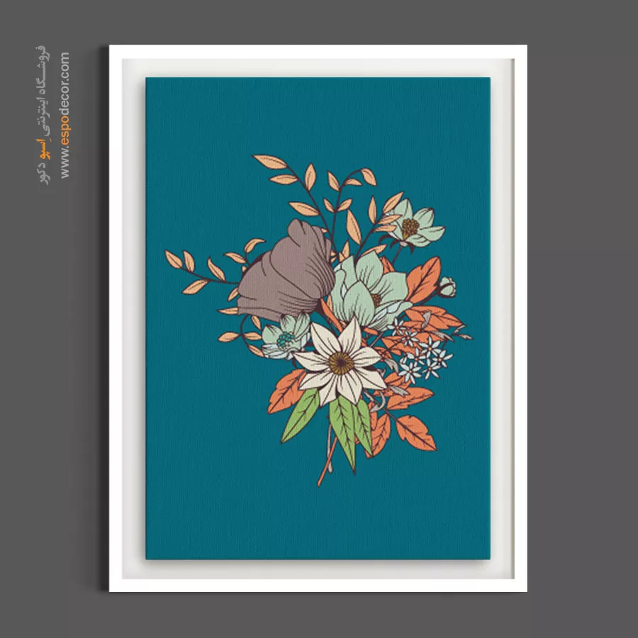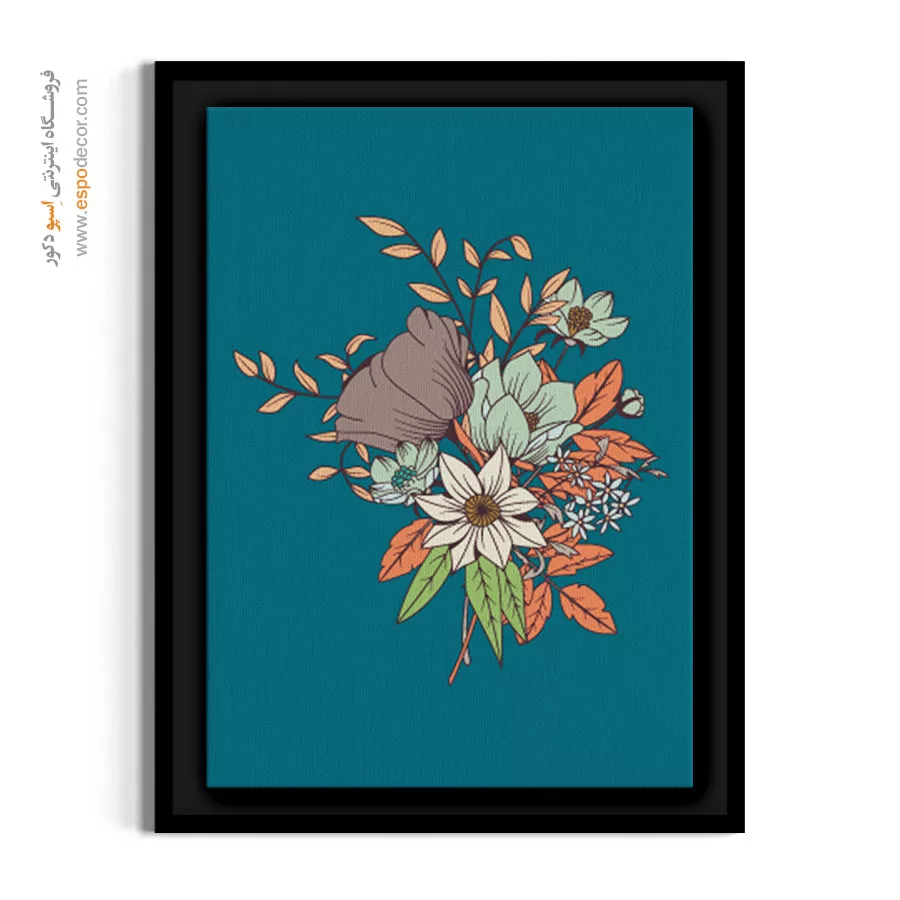 این اثر هنری با نمایش یک دستهگل فانتزی بر روی پسزمینه فیروزهای تیره تضاد رنگی چشمنوازی ایجاد کرده و با استفاده از ترکیببندی متوازن و پالت رنگی پاستلی حسی از پویایی و هنر مدرن را به فضای داخلی تزریق میکند که به دلیل سبک تصویرسازی خاص و خطوط گرافیکی انتخابی عالی برای دکوراسیونهای معاصر و ایجاد فضایی گرم و هنری در اتاق پذیرایی یا خواب است.