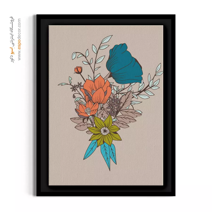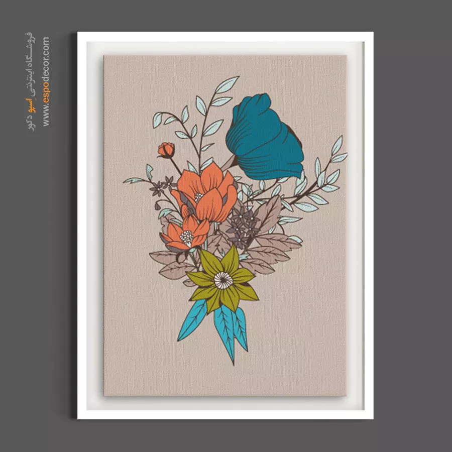 این اثر هنری با نمایش یک دستهگل فانتزی در طیف رنگی کلهغازی و نارنجی بر روی پسزمینه بژ تضاد بصری ملایم و جذابی ایجاد کرده و با تلفیق خطوط گرافیکی و فرمهای ارگانیک حسی از پویایی و هنر معاصر را به چیدمان داخلی تزریق میکند که به دلیل پالت رنگی متنوع و نگاه معمارانه در ترکیببندی انتخابی متمایز برای ارتقای هویت بصری در دکوراسیونهای مدرن بوهو و نئوکلاسیک محسوب میشود و فضایی گرم و دنج را خلق مینماید.