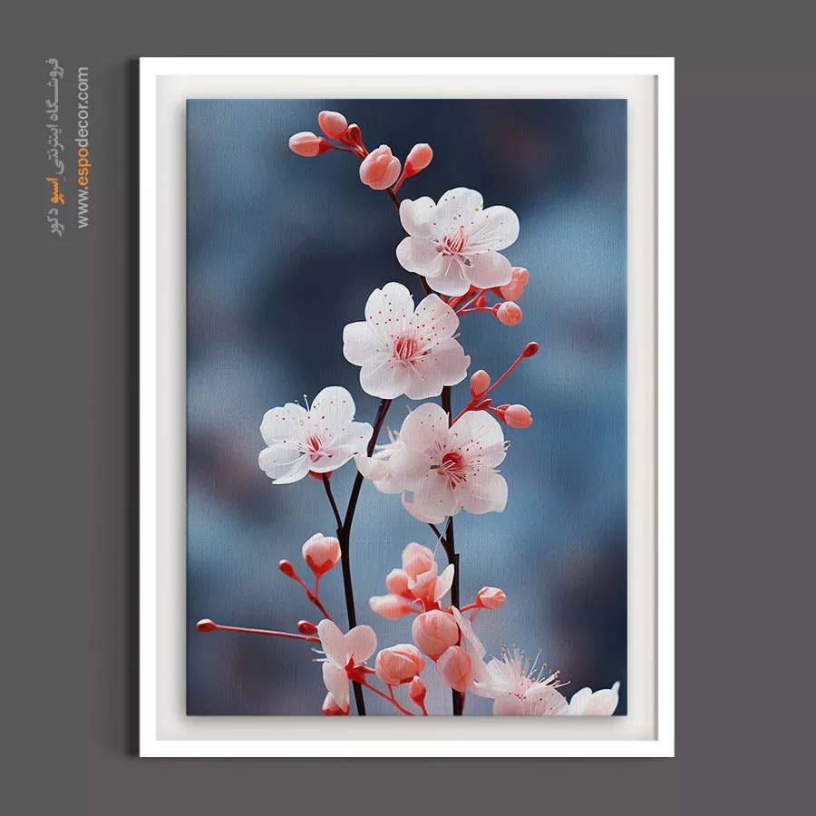 این اثر با بهرهگیری از عکاسیِ هنریِ فاینآرت، شکوه و خلوصِ شکوفههای سفیدِ گیلاس را در مقابل پسزمینهای سرد، مهآلود و آبیرنگ به تصویر کشیده است. پالت رنگیِ خنثی و سردِ این تابلو، حسی از آرامشِ ذن (Zen)، سکوت و تمرکز را به دکوراسیون تزریق میکند. ترکیببندیِ عمودی و فضای منفیِ موجود در تصویر، اتمسفری باوقار، مینیمال و معنوی خلق کرده است. بافت طبیعی پارچه بوم نقاشی به این منظرهی سرد و زیبا عمق بخشیده و سطح مات بوم مانع از ایجاد بازتاب نور میشود.