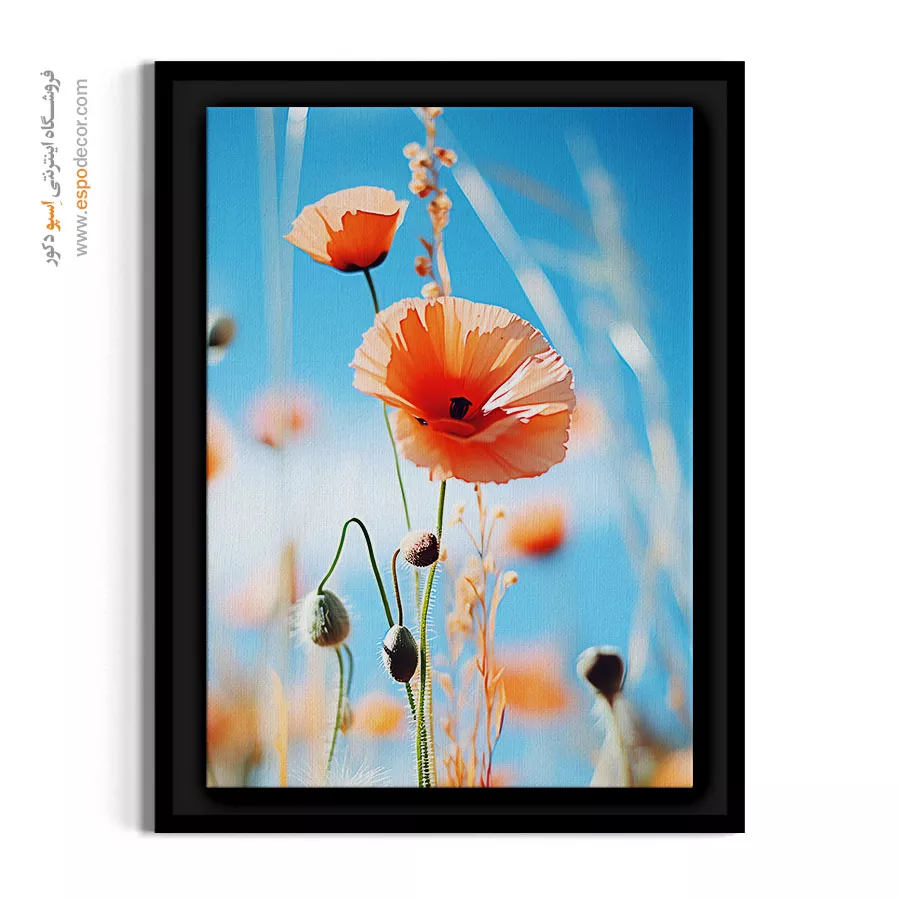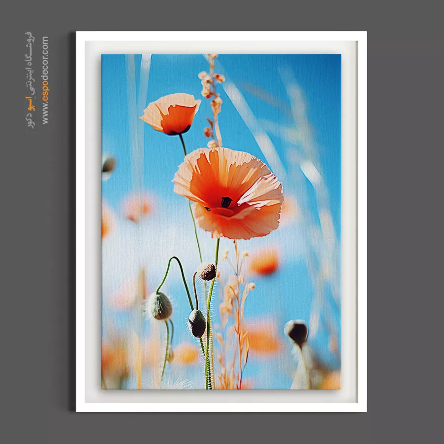این اثر با بهرهگیری از تکنیک عکاسیِ فاینآرت، شکوه و سرزندگیِ گلهای خشخاش نارنجی را در مقابل آسمانی آبی و درخشان به تصویر کشیده است. ایجاد تضاد رنگیِ قوی میان گرمایِ گلبرگهای آتشین و سردیِ آسمانِ صاف، حسی از پویایی، طراوت و انرژیِ مثبت را به دکوراسیون تزریق میکند. ترکیببندیِ عمودی و نگاهِ معمارانه در چیدمان، به این اثر ساختاری منسجم و چشمنواز بخشیده است. بافت طبیعی پارچه بوم نقاشی به رنگهای زندهی این منظره عمق داده و سطح مات بوم مانع از ایجاد بازتاب نور میشود.