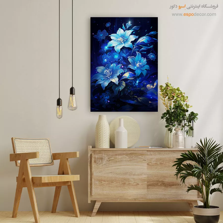 • انتخاب سایه‌های مختلف از رنگ دیوار: مانند تابلو آبی تیره روی دیوار آبی روشن، که حس آرامش و یکپارچگی در فضا ایجاد می‌کند.