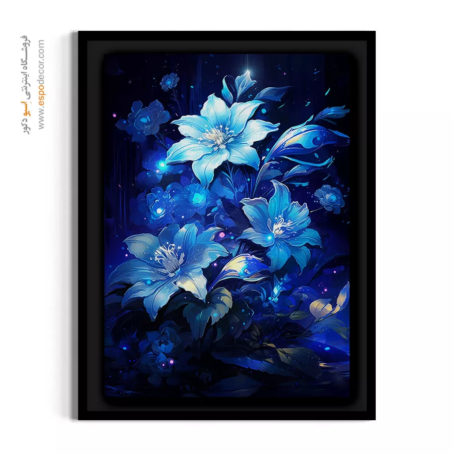 این اثر هنری با نمایشِ گلهای فانتزی و درخشان در طیف رنگیِ آبی الکتریک بر روی پسزمینهی تیره، تضاد بصریِ خیرهکننده و مسحورکنندهای ایجاد کرده است. تلفیقِ نورپردازی جادویی و رنگهای سرد و درخشان، حسی از رمز و راز، آرامشِ شبانه و زیباییِ ماورایی را به چیدمان داخلی تزریق میکند. این تابلو با پالت رنگیِ سرد و نگاهِ مدرن به طبیعت، انتخابی متمایز برای ارتقای هویت بصری در دکوراسیونهای معاصر و اتاقهای خواب محسوب شده و فضایی رویایی و عمیق را خلق مینماید.