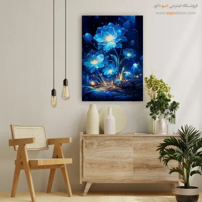 • انتخاب سایه‌های مختلف از رنگ دیوار: مانند تابلو آبی تیره روی دیوار آبی روشن، که حس آرامش و یکپارچگی در فضا ایجاد می‌کند.