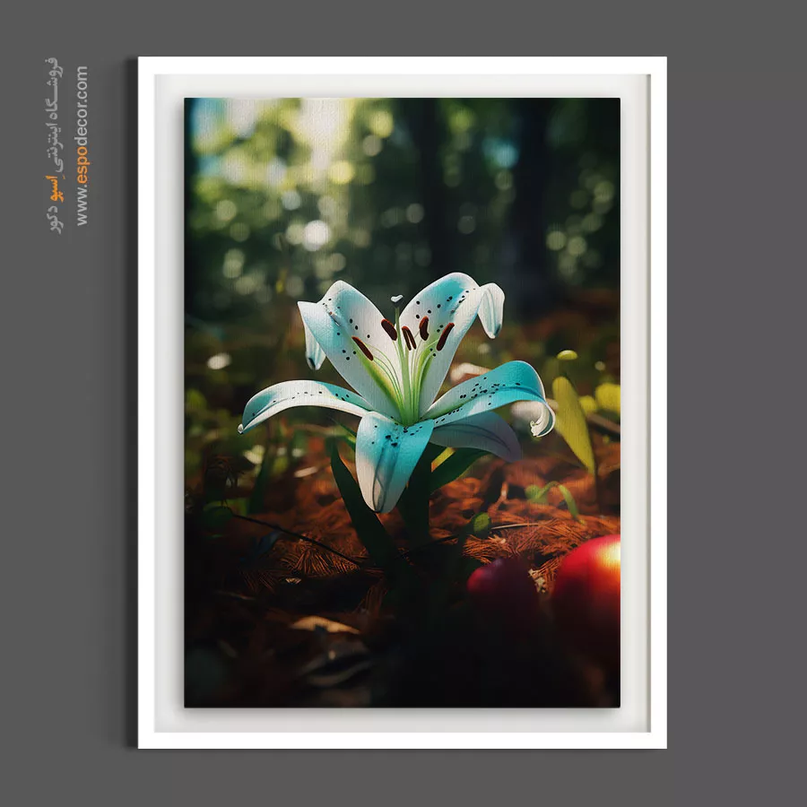 این اثر هنری با بهرهگیری از تکنیک عکاسی ماکرو درخشش یک گل سوسن سفید با لبههای آبی الکتریک را در پسزمینه محو و سبز جنگل به تصویر کشیده و با پالت رنگی خنک و ارگانیک حسی از آرامش و تازگی را به دکوراسیون تزریق میکند که به دلیل تضاد رنگی ظریف و نگاه معمارانه در ترکیببندی انتخابی هوشمندانه برای تلطیف فضا در چیدمانهای مینیمال محسوب شده و اتمسفری باوقار و روحنواز را در محیط منزل یا محیطهای اداری مدرن خلق مینماید.