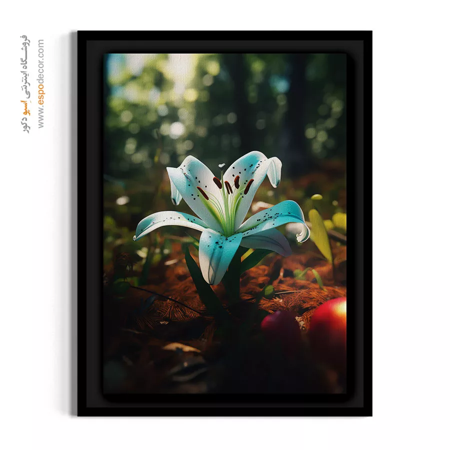 این اثر هنری با بهرهگیری از تکنیکِ عکاسیِ ماکرو، درخششِ یک گل سوسنِ سفید با لبههای آبیِ الکتریک را در پسزمینهای محو و سبز از جنگل به تصویر کشیده است. پالت رنگیِ خنک و ارگانیکِ این تابلو، حسی از آرامش، تازگی و نسیمِ خنکِ جنگلی را به دکوراسیون تزریق میکند. تضادِ رنگیِ ظریف میان سفیدیِ گل و سبزیِ محیط، در کنار نگاهِ معمارانه در ترکیببندی، اتمسفری باوقار و روحنواز را در محیط منزل یا محیطهای اداریِ مدرن خلق مینماید. بافت طبیعی پارچه بوم نقاشی به این منظرهی خنک عمق بخشیده است.