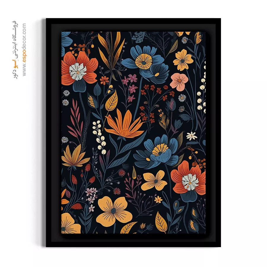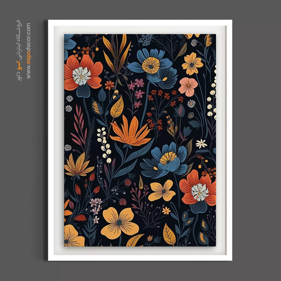 این اثر هنری با نمایشِ الگویی متراکم و چشم‌نواز از گل‌های فانتزی در طیف رنگیِ متنوعِ نارنجی، آبی و زرد بر روی پس‌زمینه‌ی تیره، تضاد بصریِ جذاب و زنده‌ای ایجاد کرده است. تلفیقِ خطوطِ ظریفِ گرافیکی و فرم‌های ارگانیک، حسی از وقار، اصالت و هنرِ دست‌ساز را به چیدمان داخلی تزریق می‌کند. این تابلو با پالت رنگیِ غنی و نگاهِ معمارانه در طراحیِ الگو، انتخابی متمایز برای ارتقای هویت بصری در دکوراسیون‌های مدرن، بوهو و نئوکلاسیک محسوب شده و اتمسفری دنج، گرم و صمیمی را در محیط خانه خلق می‌نماید.