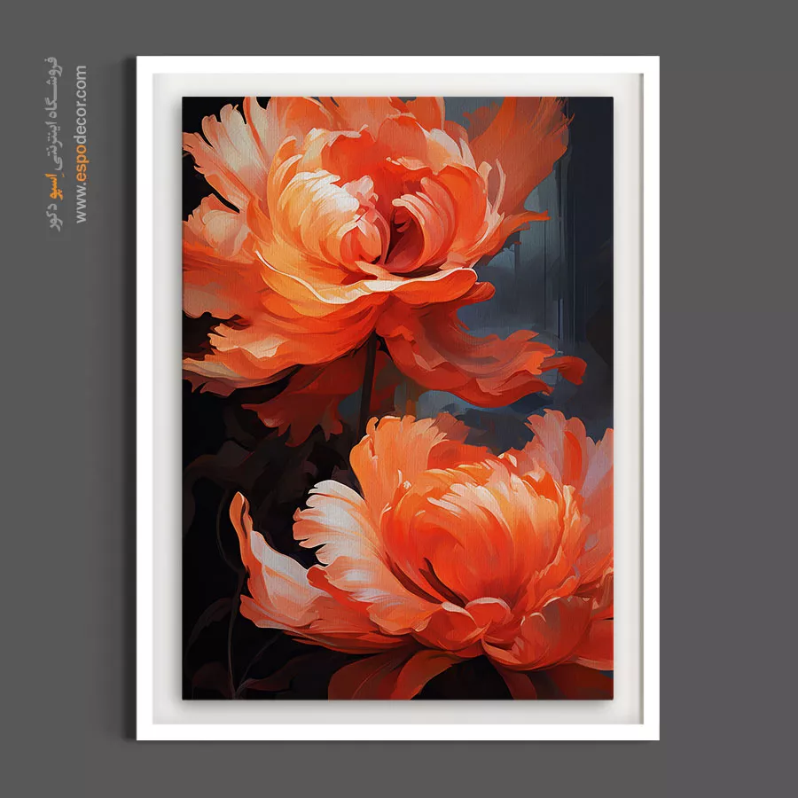 این شاهکار هنری با نمایشِ جسورانه و امپرسیونیستیِ شکوفههای نارنجیِ درخشان در بستری از سایههای عمیق و تیره، بازی مسحورکنندهای از نور و حرکت را بر روی بافت بوم خلق کرده است. پالت رنگی گرم و ضربقلمهای آزاد، حسی از انرژی، شور و درام را به فضا منتقل میکند. این تابلو با ایجاد تضاد بصری قوی، نگاه را به خود خیره کرده و به عنوان یک اثر هنریِ مدرن و پرقدرت در فضا عمل میکند. بافت طبیعی پارچه بوم نقاشی به این لایههای رنگیِ ضخیم جان بخشیده و سطح مات بوم مانع از ایجاد بازتاب نور میشود.