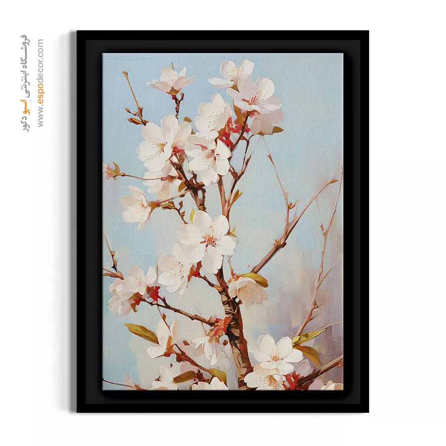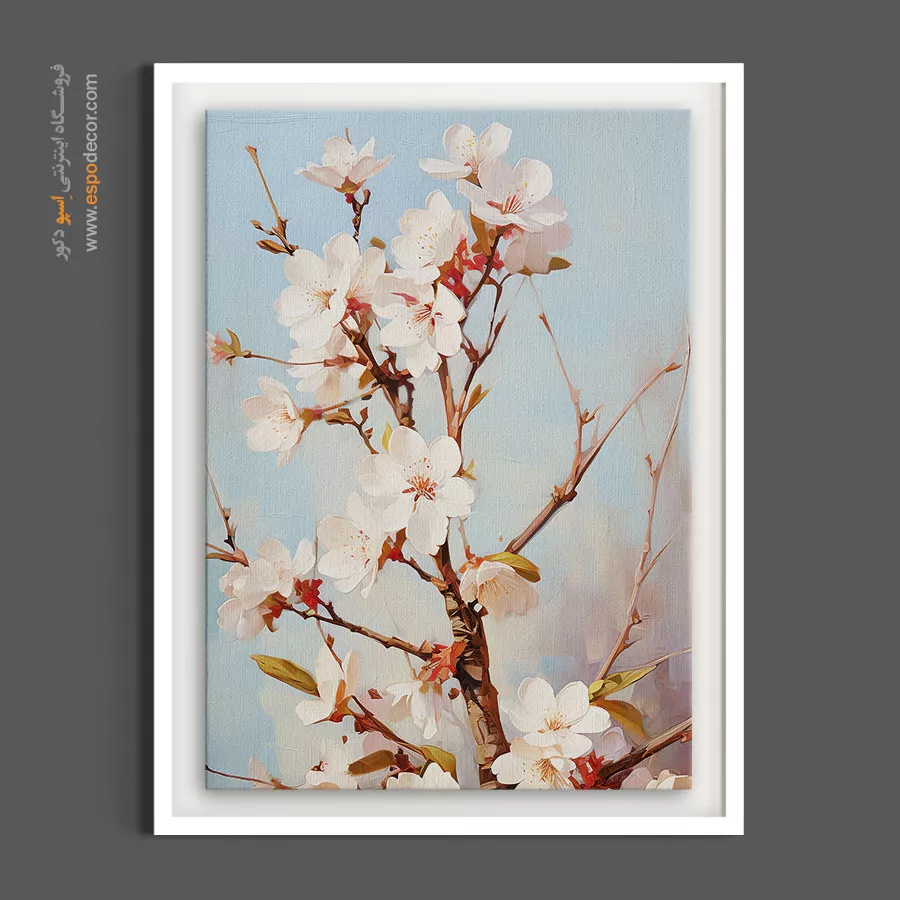 این اثر با نمایش شکوفه‌های سپید بر پس‌زمینه آبی ملایم، انتخابی شاعرانه برای سالن‌های پذیرایی نوردیک، اتاق خواب‌های مدرن و کلینیک‌های زیبایی است که حسی از وسعت را به محیط تزریق می‌کند. طراحی مینیمال و پالت رنگی روشن آن به خوبی با چیدمان‌های خلوت هماهنگ شده و اتمسفری سرشار از وقار و آرامش بهاری را در قلب فضای زندگی شما متجلی می‌سازد.