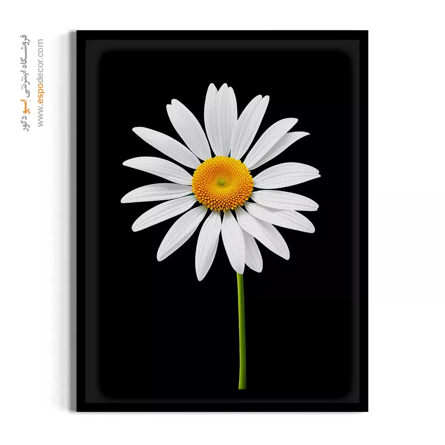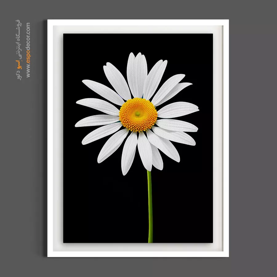 این اثر با نمایش تکگل بابونه بر پسزمینه مشکی عمیق، انتخابی هوشمندانه برای پذیراییهای مدرن، اتاق خوابهای مینیمال و محیطهای اداری شیک است که وقار بصری ایجاد میکند. کنتراست شدید نوری در این تابلو، حسی از نظم را به چیدمانهای معاصر تزریق کرده و به خوبی با دیوارهای خنثی و تیره هماهنگ شده و به عنوان یک نقطه کانونی مقتدر عمل مینماید.