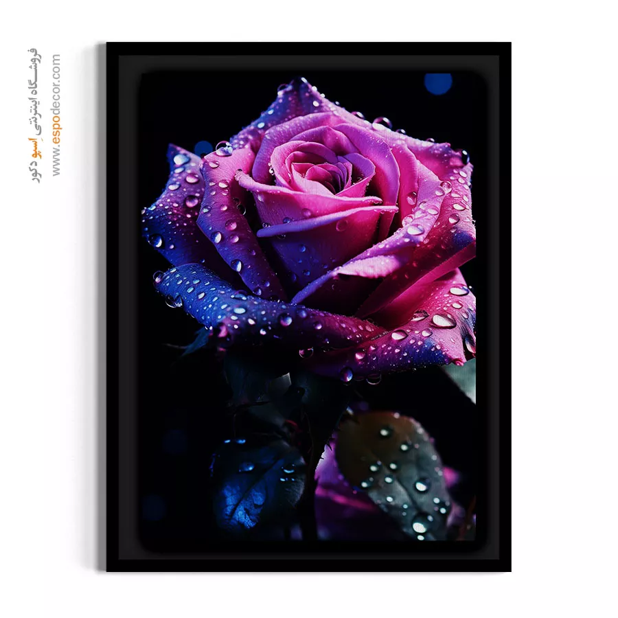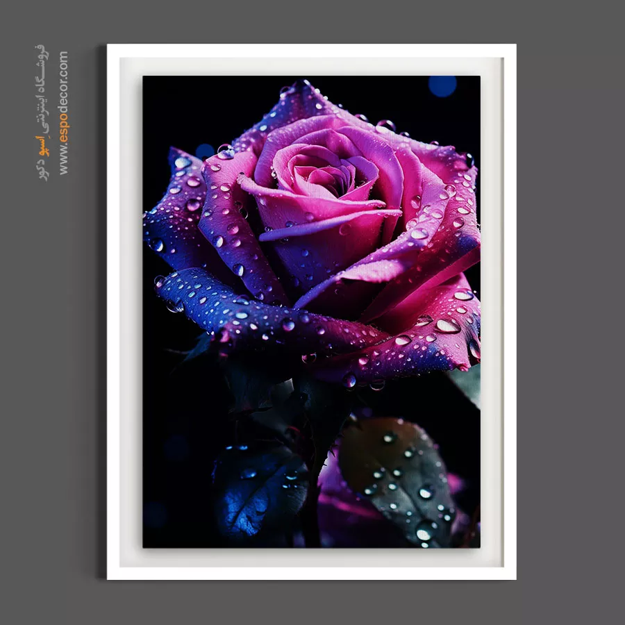 این اثر شاهکاری بصری از بافت مخملی یک رز بنفش است که با قطرات الماسگونه شبنم تزیین شده و حسی از تجمل و رازآلودگی را به بیننده منتقل میکند. تضاد رنگی خیرهکننده میان بنفش عمیق و نورپردازی سردِ پسزمینه، این تابلو را به انتخابی مقتدر برای اتاقهای خواب مستر، سالنهای پذیرایی مجلل، کلینیکهای زیبایی و راهروهای لوکس تبدیل کرده است.