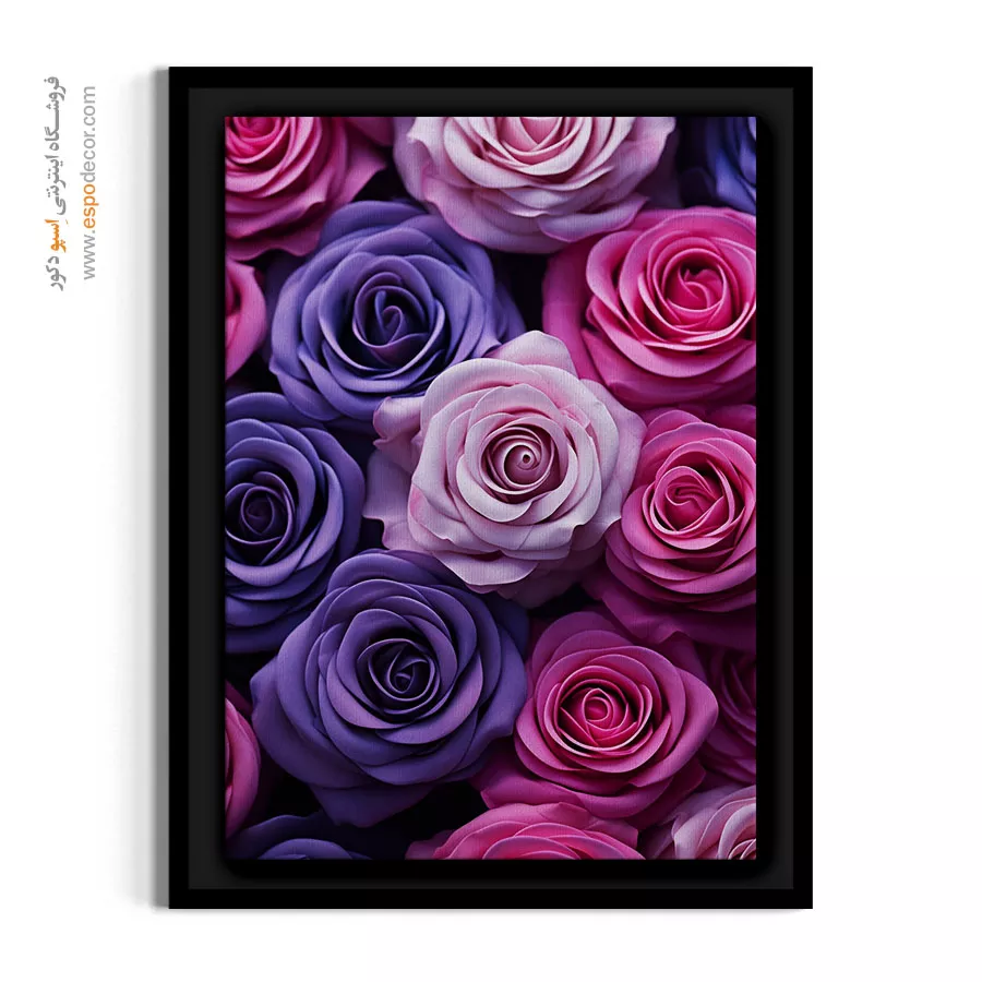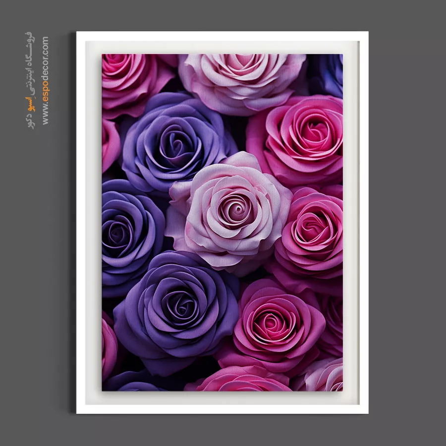 این اثر هنری نمایشی باشکوه از تجمع رزهای شکوفا در طیف‌های مسحورکننده بنفش، یاسی و صورتی است که حسی از فراوانی و کمال طبیعت را به فضای داخلی شما تزریق می‌کند. بافت مخملی و چیدمان متراکم گلبرگ‌ها در این تصویر، اتمسفری گرم، صمیمی و در عین حال اشرافی خلق می‌کند. این تابلو انتخابی مقتدر برای دیوارهای اصلی سالن پذیرایی، بالای تخت‌خواب در اتاق‌های مستر و یا مزون‌های مدرن است.