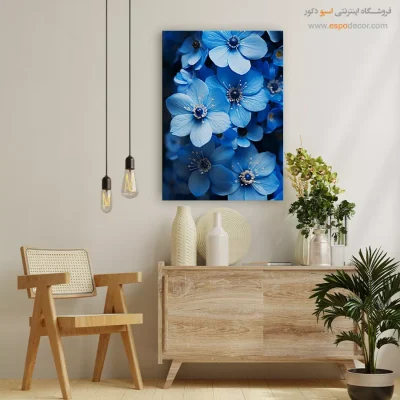 • انتخاب سایه‌های مختلف از رنگ دیوار: مانند تابلو آبی تیره روی دیوار آبی روشن، که حس آرامش و یکپارچگی در فضا ایجاد می‌کند.