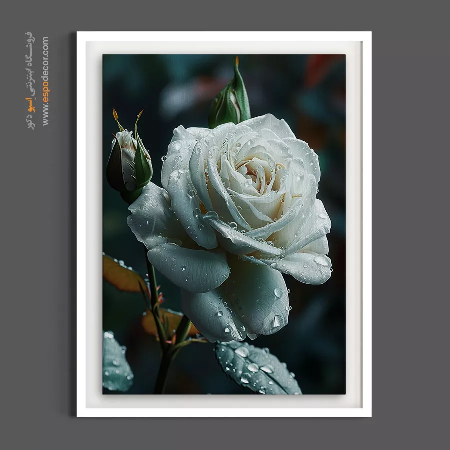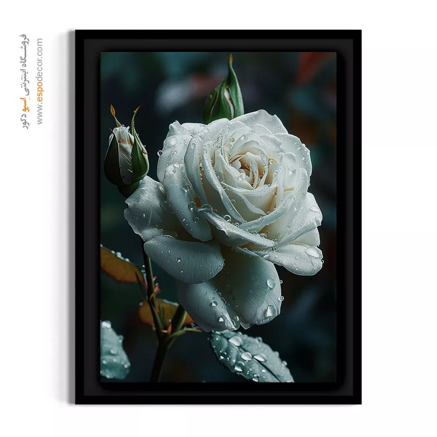 درخشش الماسگونه قطرات آب بر روی بافت نرم و کرمی گل، کنتراست بصری بینظیری با پسزمینه تیره و عمیق ایجاد کرده و این تابلو را به نقطهای کانونی و آرامبخش برای سالنهای پذیرایی مدرن، اتاقهای خواب مستر و دیوارهای کانونی در لابیهای مجلل تبدیل میکند.