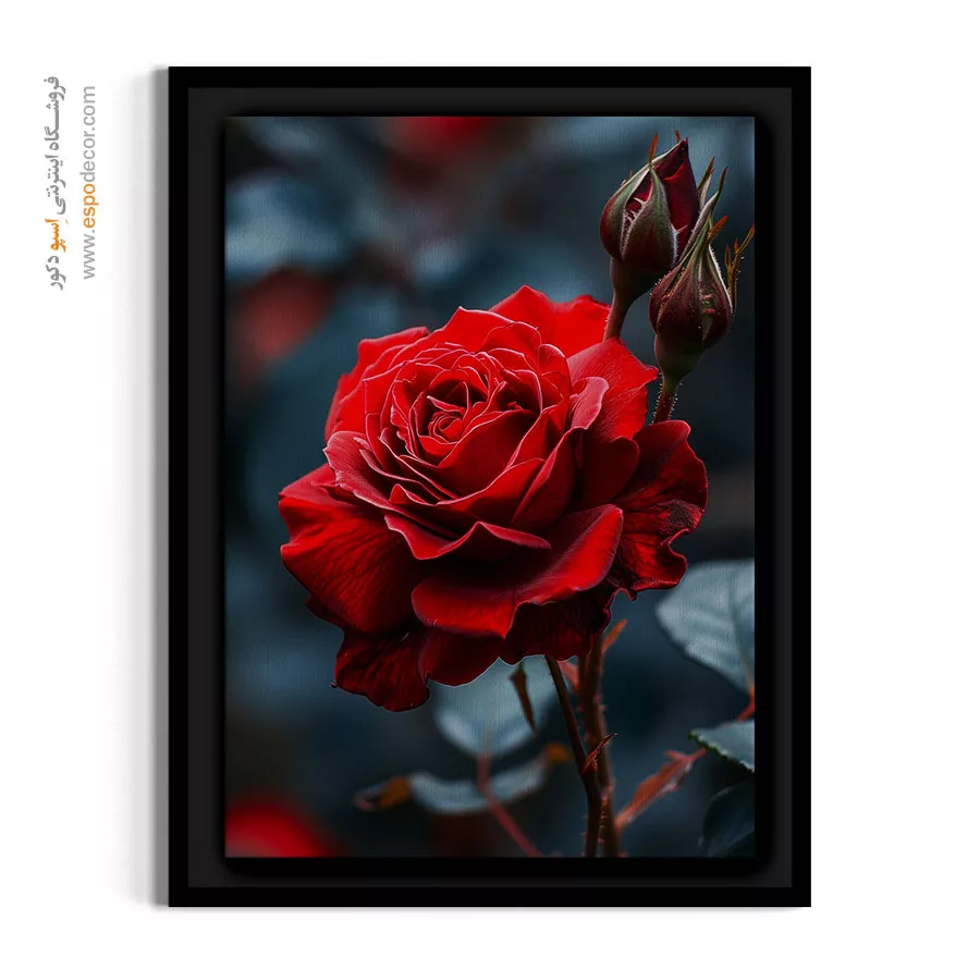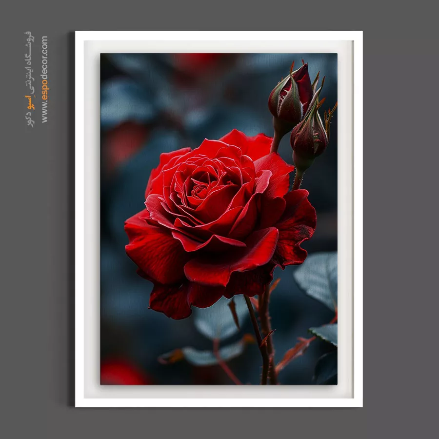 این اثر با نمایش خیرهکننده یک رز سرخ در کنار غنچههای نوپا، نمادی از کمال و شور زندگی است که با بافت مخملی خود، نگاه هر بینندهای را تسخیر میکند. تضاد رنگی میان قرمزی آتشین گلبرگها و پسزمینه تیره، این تابلو را به نقطهای کانونی و مقتدر برای ارتقای استایل سالنهای پذیرایی و اتاقهای مستر تبدیل کرده است.