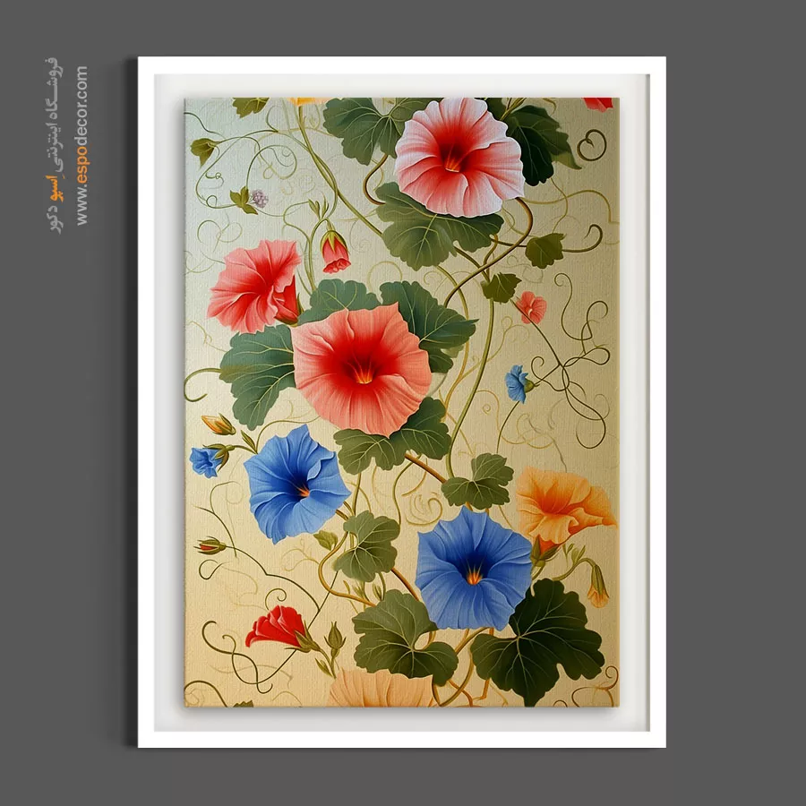 این اثر با ترکیب هنرمندانه گلهای اطلسی در طیفهای سرخ، آبی و نارنجی بر بستری از پیچکهای اسلیمی، حسی از اصالت و شکوه باغهای کلاسیک را تداعی میکند. طراحی وینتیج و پالت رنگی متنوع این تابلو، آن را به انتخابی بینظیر برای دکوراسیونهای نئوکلاسیک و دیوارهایی با کاغذدیواری ساده یا قاببندیهای گچی تبدیل کرده است.