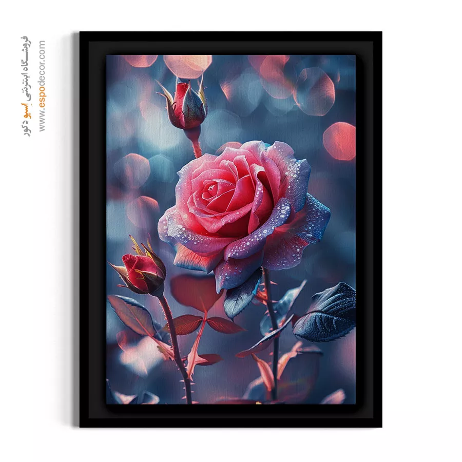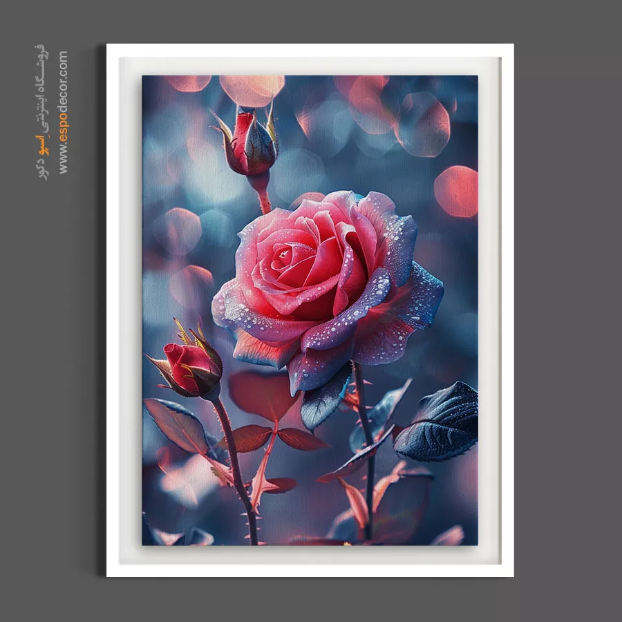 این اثر با تلفیق جسورانه طیفهای صورتی مرجانی و درخشش نئونی در لبهی گلبرگها، اتمسفری فرامادی و سرشار از جادو را به فضای داخلی شما هدیه میدهد. تلالو قطرات شبنم در بستر بوکههای نوری، این تابلو را به انتخابی بیرقیب برای خلق یک نقطه کانونی شاعرانه در اتاقهای خواب و پذیرایی مدرن تبدیل کرده است.