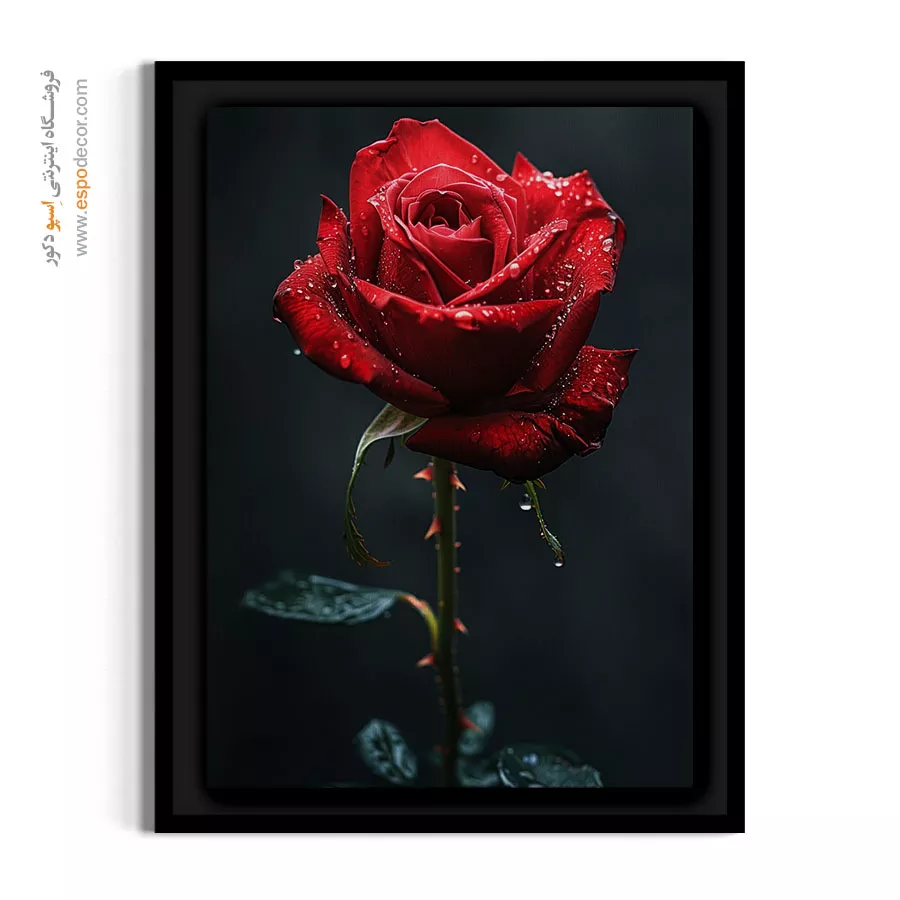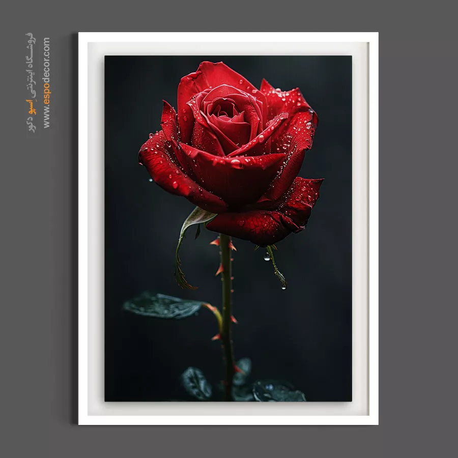 این اثر با نمایش خیرهکننده بافت مخملی گلبرگهای رز در آغوش قطرات باران، اتمسفری سرشار از ابهت و شور را در فضای داخلی خلق میکند. تضاد میان سرخِ یاقوتی و پسزمینه دودی، این تابلو را به انتخابی مقتدر برای پذیراییهای لوکس و اتاقهای مستر جهت بازتعریف هویت بصری محیط تبدیل کرده است.