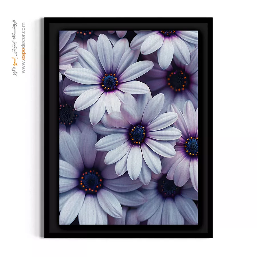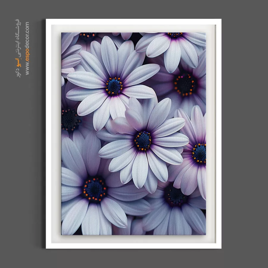 این اثر با نمایش متراکم گلبرگهای مروارید در تلاقی فامهای یاسی و سفید، اتمسفری سرشار از سکون و نظم بصری را در فضای داخلی خلق میکند. ترکیب رنگی ملایم در کنار کنتراستِ آبیِ عمیق در مرکز گلها، این تابلو را به انتخابی هوشمندانه برای تلطیف دکوراسیونهای مدرن و اتاقهای خواب دلباز تبدیل کرده است.