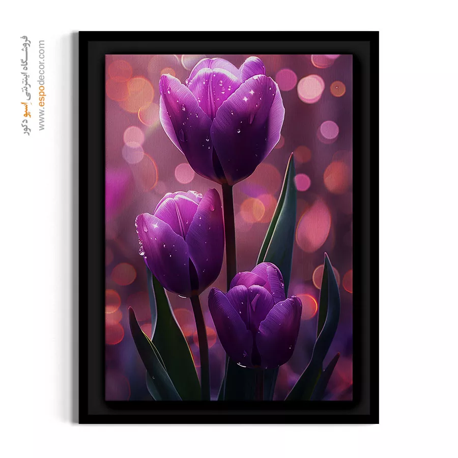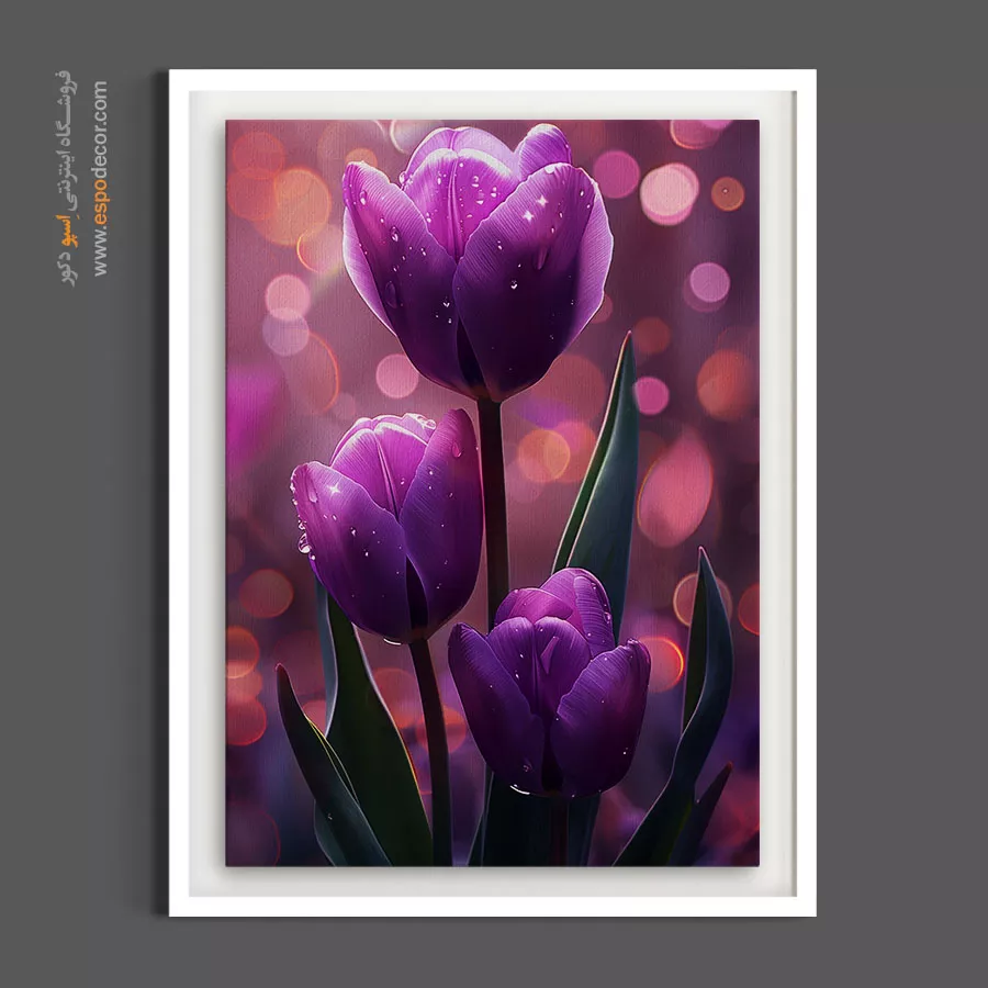 این اثر با تجسم سه لاله مقتدر در میان هالهای از نورهای اثیری و قطرات زلال شبنم، حسی از جادو و سکون بصری را به فضای شما هدیه میدهد. پالت رنگی ارغوانی عمیق در کنار درخشش بوکههای پسزمینه، این تابلو را به انتخابی هوشمندانه برای ایجاد نقطهای کانونی در پذیراییهای لوکس و اتاقهای مستر تبدیل کرده است.