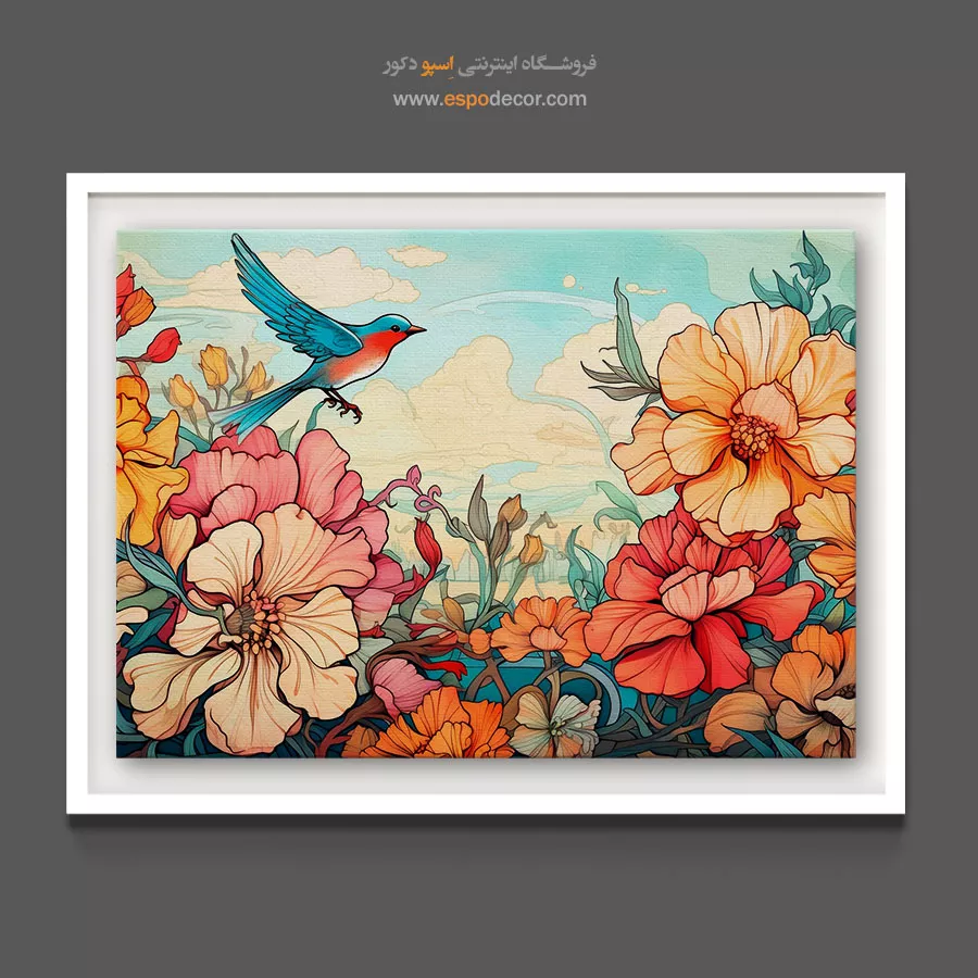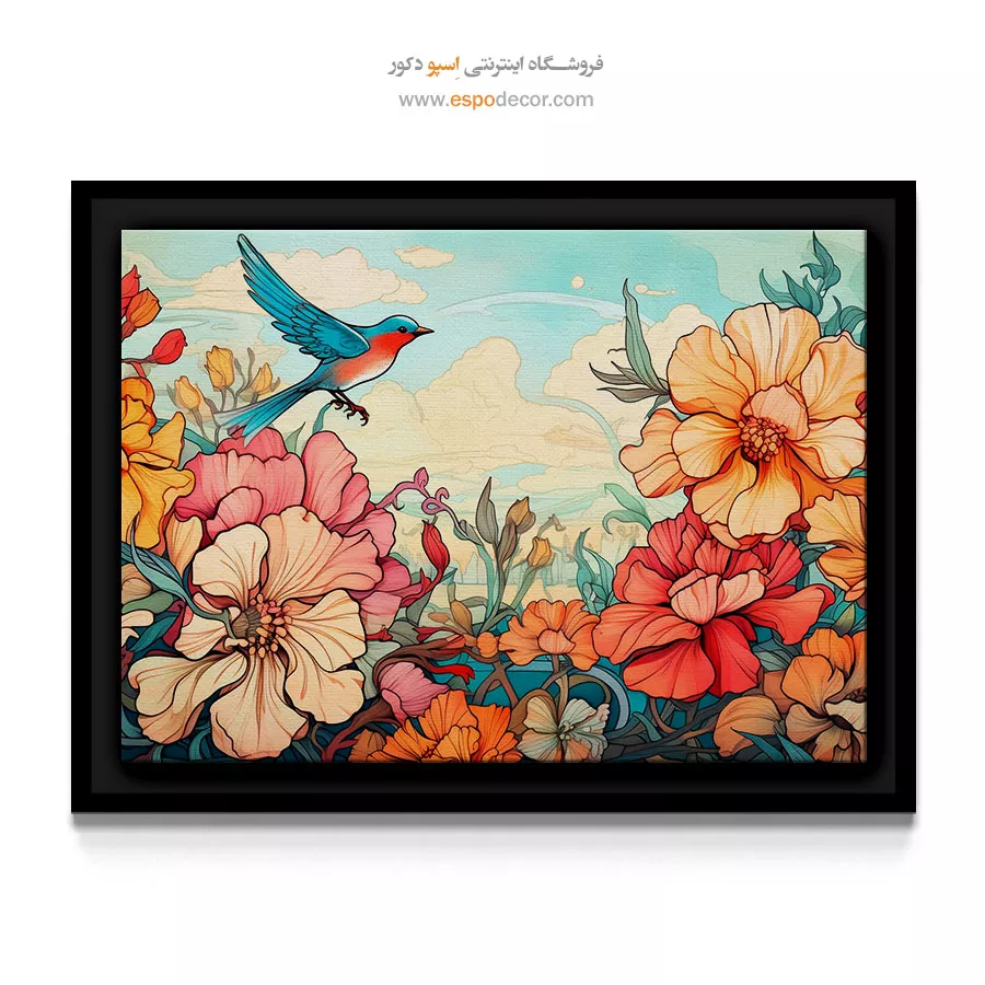 این تابلو یک اثر فوق‌العاده روشن، شاداب و هنری است که با نمایش پرنده و گل‌های بزرگ در سبک تزئینی، حسی از سرزندگی، آزادی و طبیعت شکوفا را منتقل می‌کند. تضاد رنگی فیروزه‌ای پرنده و مرجانی گل‌ها، آن را به یک قطعه برجسته تبدیل کرده که برای اتاق نشیمن، اتاق خواب‌های جوانان، یا فضاهای با دکوراسیون شاد، بوهو یا مدرن انتخابی ایده‌آل است.