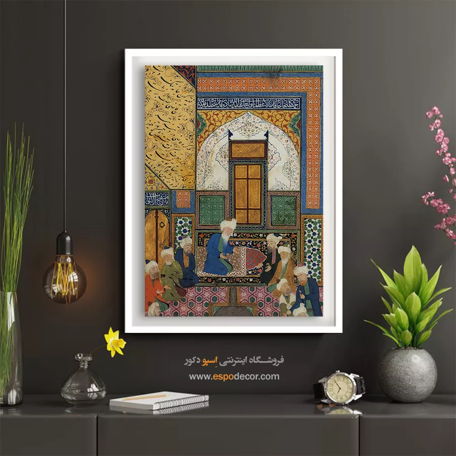 این توصیف دقیق و معنادار، تابلو نقاشی ایرانی را از یک عنصر صرفاً تزیینی فراتر میبرد و به قطعهای مناسب برای اتاق مطالعه، کتابخانهٔ خانگی، دفتر کار، لابی یا فضاهای فرهنگی بدل میکند. پالت فیروزهای و لاجوردی در کنار طلاییهای ظریف، با دیوارهای خنثی یا چوب طبیعی همنشینی دلنشینی دارد و میتواند نقطهٔ کانونی دکوراسیون شما باشد. اگر به دنبال قطعهای اصیل با هویت ایرانی و روایت روشن هستید، «محقق دانا و قاضی مغرور» انتخابی ماندگار است که ارزشهای بصری و محتوایی تابلو نقاشی ایرانی را یکجا پیش چشم میگذارد.
