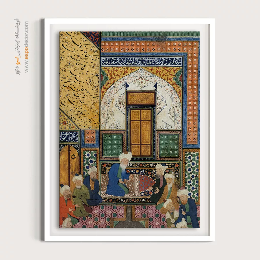 این تابلو نقاشی ایرانی با عنوان «محقق دانا و قاضی مغرور – بوستان و گلستان سعدی» بازنمایی شاعرانهای از مجلس درس و گفتوگوست؛ جایی که پیر خرد در جامهٔ لاجوردی در مرکز نشسته و حلقهای از شاگردان و اهل قضا پیرامون او گرد آمدهاند. صحنه درون معماری اسلامی شکل گرفته: محراب گنبدی، قابهای معرق و کاشیهای سبز و فیروزهای، حاشیههای هندسی نارنجی و طلایی و کتیبههای خوشنویسی که بر فراز دیوار میدرخشند. فرشهای گلدار و ریزنقش، بافت گرم و انسانی فضا را تکمیل میکند و حرکت نگاه را از حاشیههای تزیینی به مرکز روایت هدایت میسازد. اثر با زبان نگارگری ایرانی—ریتم خطوط، تناسب چهرهها و توازن رنگهای گرم و سرد—پیامی اخلاقی از فروتنی و برتری دانش را منتقل میکند؛ همان مضمونی که سعدی در حکایت «محقق دانا و قاضی مغرور» یادآور میشود.