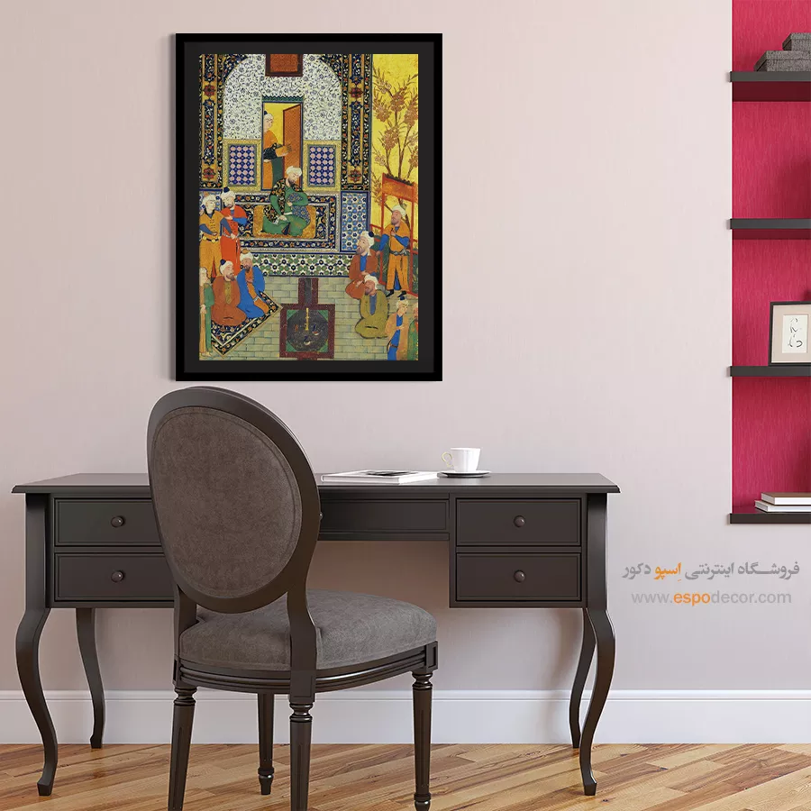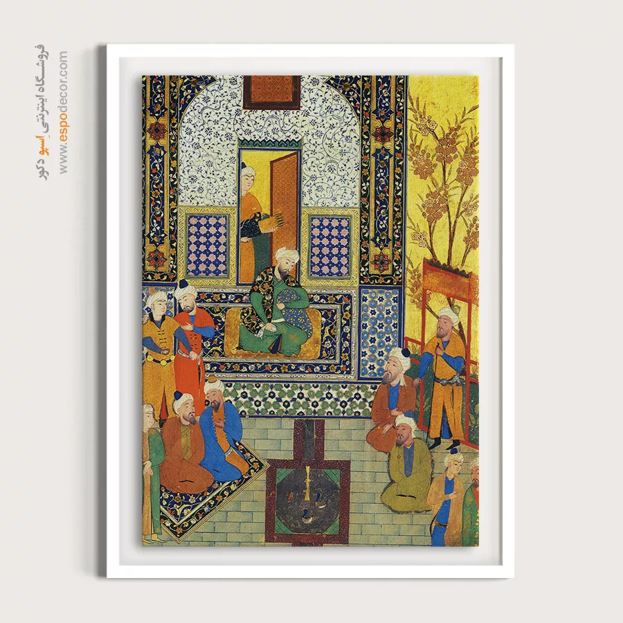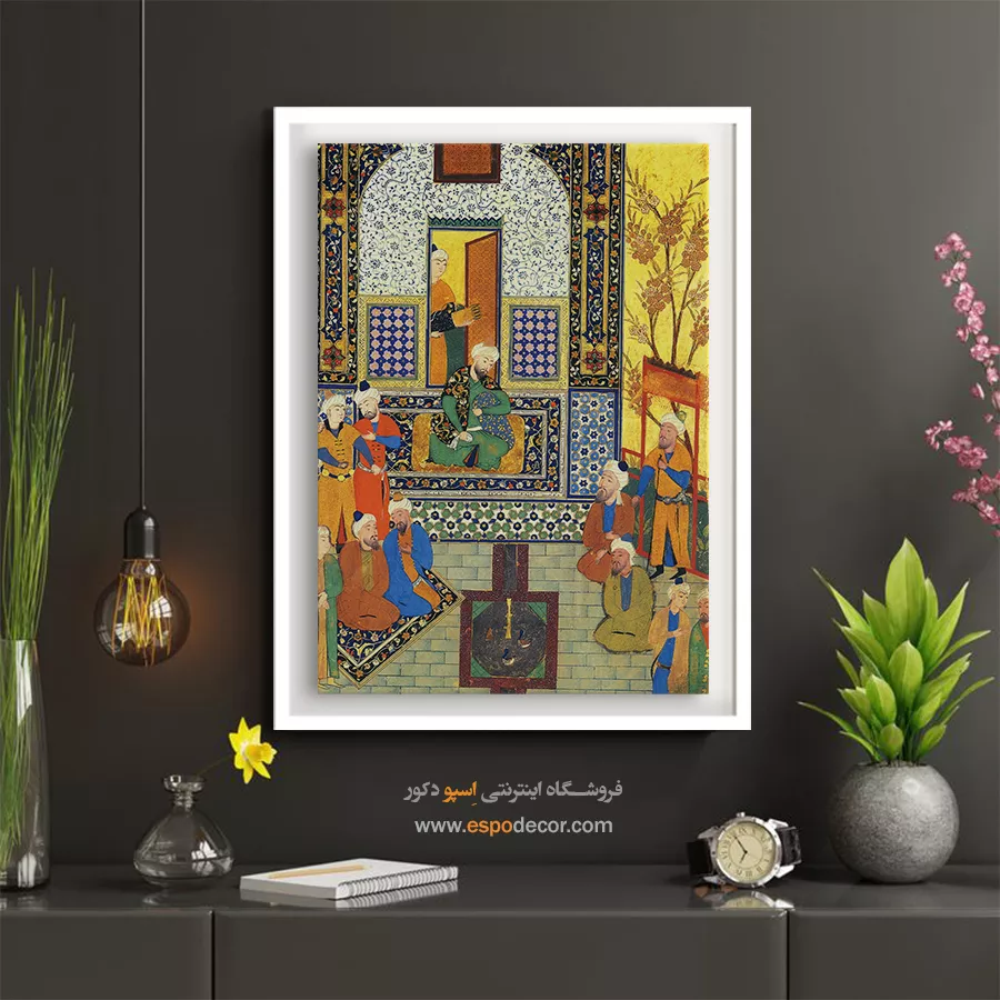 این اثر نمایی درخشان از مجلس گفتوگو در دربار یا مدرسهای ایرانی است؛ جایی که شخصیتی مرکزی بر سکویی مزین نشسته و حلقهای از یاران و شاگردان پیرامون او جمع شدهاند. دیوارها با طلااندازی لطیف و کاشیکاریهای چندرنگ جان گرفته، و قابهای هندسی و ختایی با حاشیههای سیاه و زرین فضای تصویر را میبندند. تابلو نقاشی سنتی در اینجا نه فقط روایتِ یک صحنه، بلکه بازتابی از نظم، شأن و گفتوگوی خردمندانه است.
