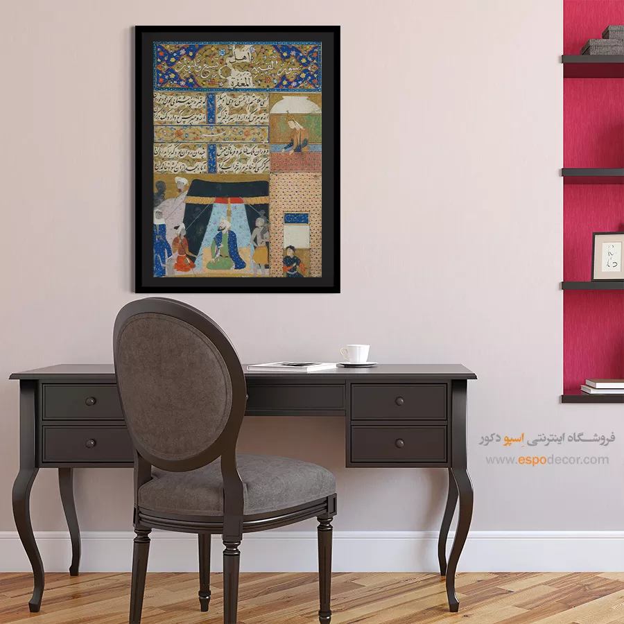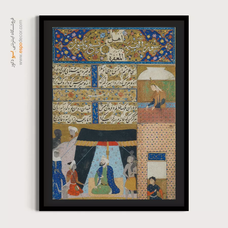 این تابلو فشردهای از فرهنگ بصری ایران است—همنشینی شعر، تذهیب و اجتماع آدمیان—و تعریفی دقیق از نقاشی کلاسیک ایرانی روی تابلو ارائه میدهد؛ اثری ماندگار که هر نگاه به آن، مانند خواندن بیتی از سعدی، فضا را روشن و دل را آرام میکند.