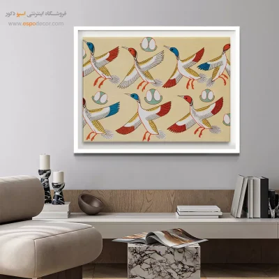 • استفاده از تابلویی با رنگ خنثی در پس‌زمینه: رنگ‌های سفید، خاکستری یا بژ، در حالی که رنگ اصلی دیوار یا رنگ‌های جزئی مبلمان و اکسسوری‌ها در طرح آن تکرار شده باشد. این روش تعادل را در فضا تضمین کرده و از شلوغی بصری جلوگیری می‌کند.