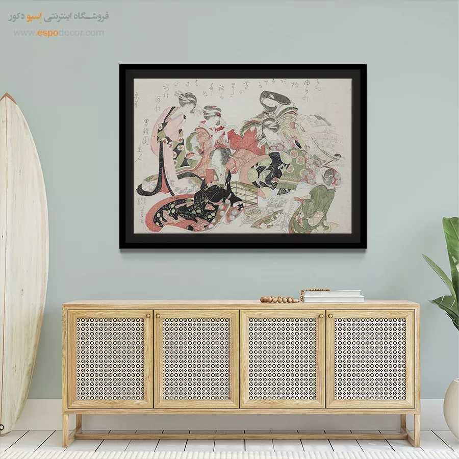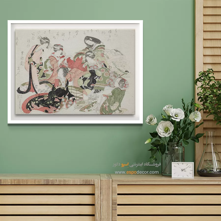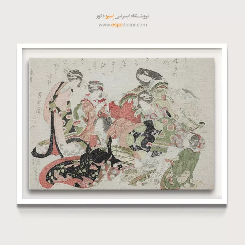 شش زن دور یک قفس پرنده نشسته اند – تابلو نقاشی هوکوسای