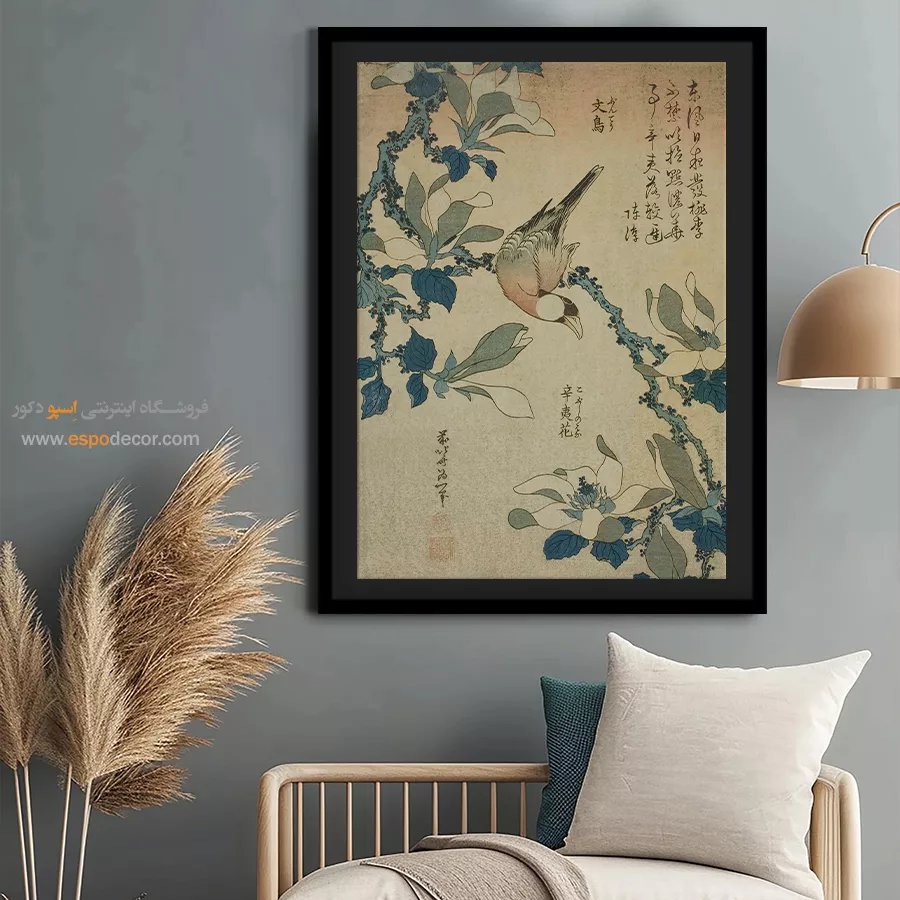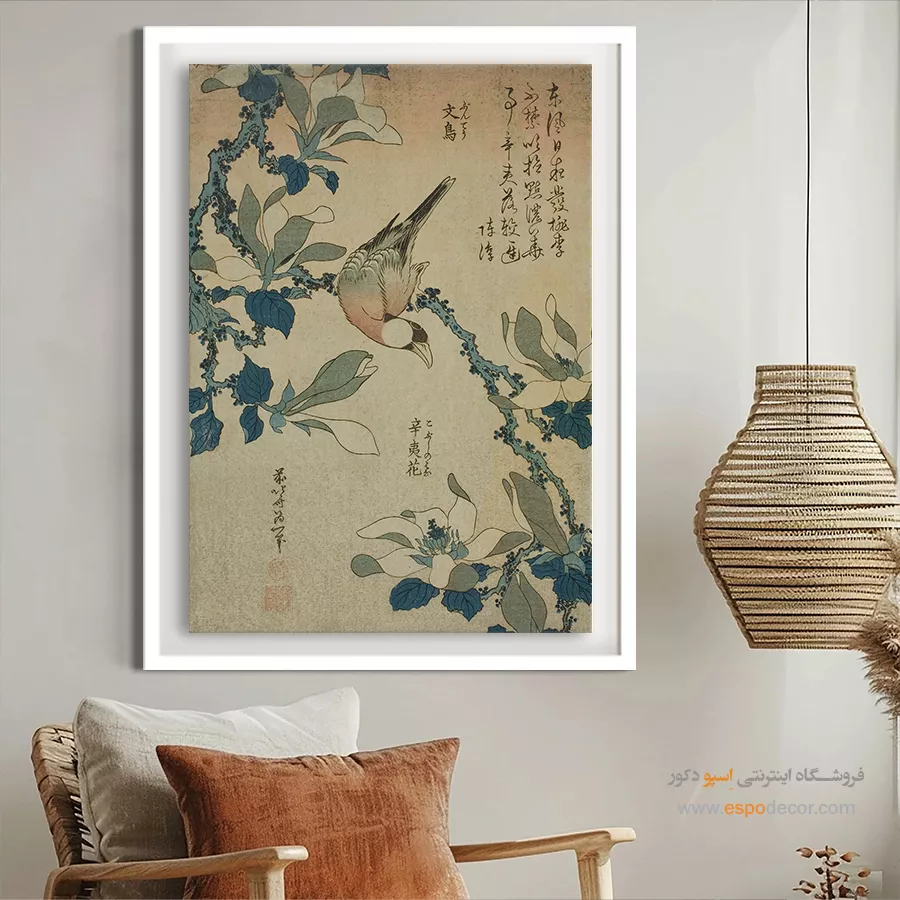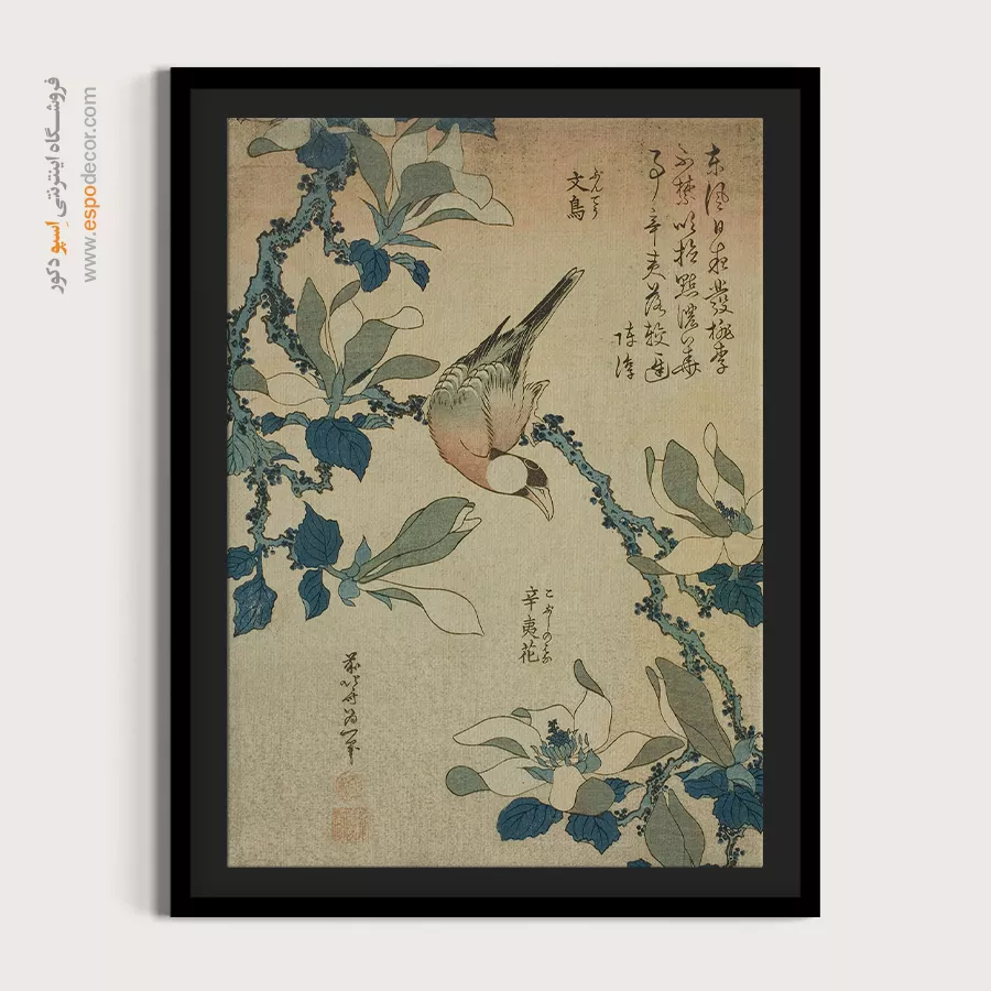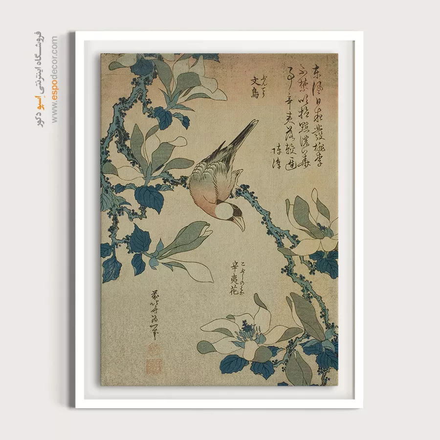 پرنده شالیزار و گل مگنولیا – تابلو نقاشی هوکوسای