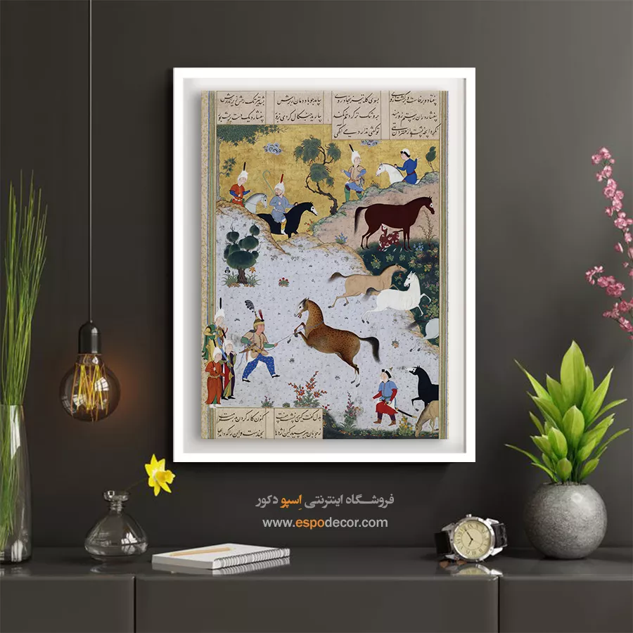 در دل هر نقش و رنگ، قصه‌ای کهن از سرزمین شعر و شکوه نهفته است. این تابلو نقاشی ایرانی برگرفته از اصالت نگارگری و ظرافت مینیاتورهای ماندگار، پلی میان تاریخ و دنیای امروز می‌سازد؛ گویی پنجره‌ای است به جهانی که در آن زیبایی و معنویت هم‌نشین‌اند. هر تابلو، برگ زرینی از نسخ خطی و هنر سنتی ایرانی است؛ سرشار از لطافت خطوط و رنگ‌هایی که به آرامی با چشم و دل سخن می‌گویند. با تماشای آن، می‌توان به عمق فرهنگ ایرانی سفر کرد و لمس کرد که چگونه گذر قرن‌ها نتوانسته فروغ این هنر جاودان را خاموش سازد. این تابلوها بر روی بوم‌های باکیفیت چاپ می‌شوند؛ بافت لطیف بوم و رنگ‌های زنده، جلوه‌ای طبیعی و هنری به اثر می‌بخشند. رنگ‌ها به گونه‌ای انتخاب شده‌اند که درخشان، ماندگار و مقاوم در برابر نور باشند؛ تا سالیان سال، زیبایی اصیل ایرانی در فضای خانه یا محل کارتان بدرخشد. فریم‌های محکم، ساختاری استوار به تابلو می‌بخشند و با طراحی ظریف خود، بر شکوه اثر می‌افزایند. سبک بودن تابلو و امکان نصب آسان، آن را برای هر نوع دکوراسیون مدرن یا کلاسیک مناسب می‌سازد. از اتاق نشیمن تا دفتر کار، این آثار همچون نگینی فاخر بر دیوار خواهند درخشید. هر اثر، فرصتی برای لمس دوباره‌ی هنر نگارگری و مینیاتور ایرانی است؛ هنری که در جزئی‌ترین خطوط، روح شاعرانه ایرانیان را بازمی‌تاباند. این تابلوها نه تنها تزیینی، بلکه یادآور هویت فرهنگی و زیبایی بی‌زمان ایران‌زمین‌اند. اگر به دنبال هدیه‌ای ماندگار یا اثری منحصر به فرد برای فضای زندگی‌تان هستید، این تابلو بوم نگارگری ایرانی انتخابی بی‌همتاست. ترکیب اصالت تاریخی با کیفیت مدرن چاپ، ارزش هنری و زیبایی را در یک قاب جاودانه به شما تقدیم می‌کند.