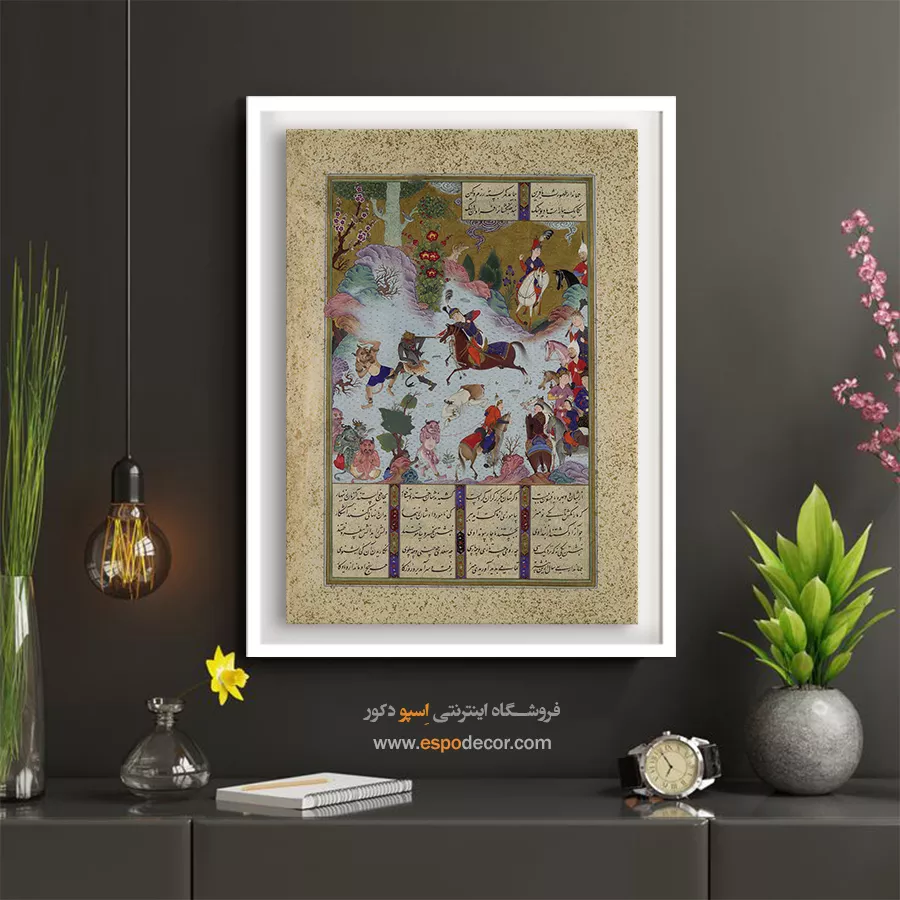 در ظرافت خطوط و درخشش رنگها، روایت هزارساله هنر مینیاتور و نگارگری ایرانی زنده میشود. این تابلو نقاشی ایرانی، یادگاری فاخر از میراث فرهنگی ایران برای خانهای آراسته و روحنواز است.