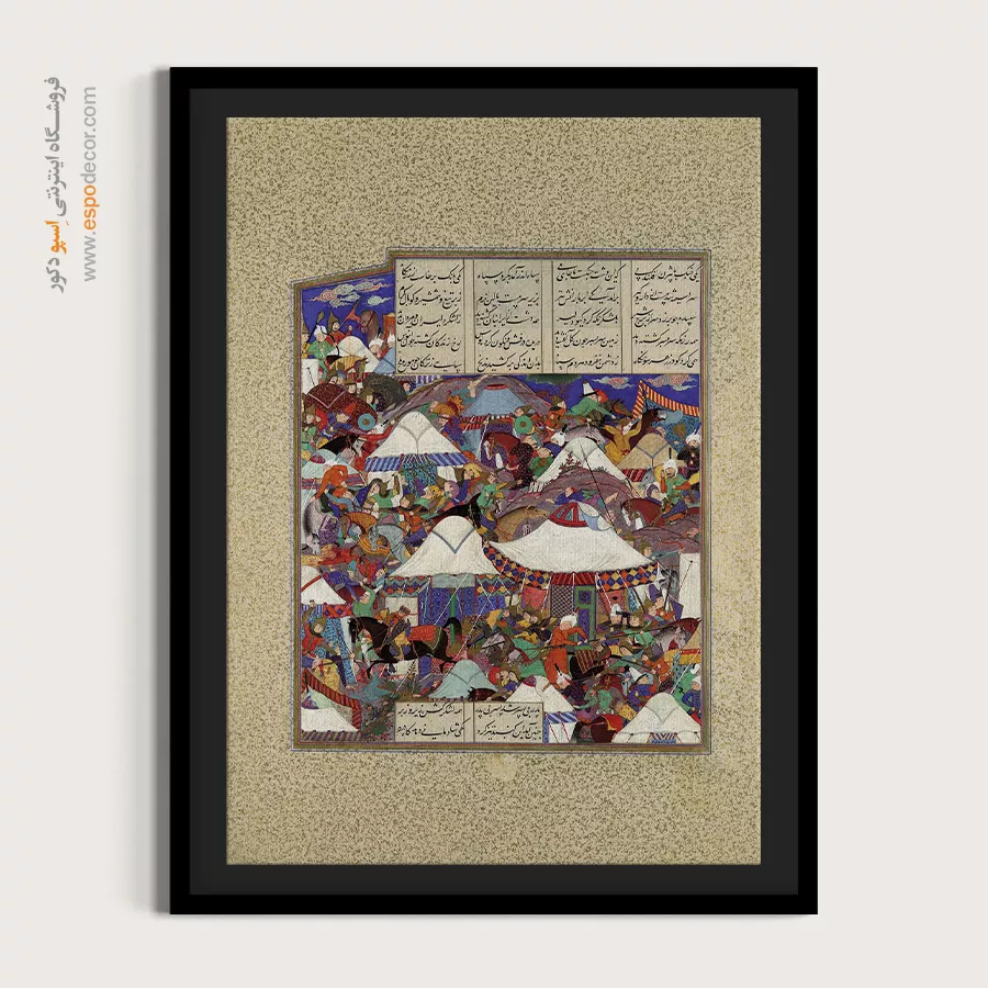 در دل هر نقش و رنگ، قصه‌ای کهن از سرزمین شعر و شکوه نهفته است. این تابلو نقاشی ایرانی برگرفته از اصالت نگارگری و ظرافت مینیاتورهای ماندگار، پلی میان تاریخ و دنیای امروز می‌سازد؛ گویی پنجره‌ای است به جهانی که در آن زیبایی و معنویت هم‌نشین‌اند.هر تابلو، برگ زرینی از نسخ خطی و هنر سنتی ایرانی است؛ سرشار از لطافت خطوط و رنگ‌هایی که به آرامی با چشم و دل سخن می‌گویند. با تماشای آن، می‌توان به عمق فرهنگ ایرانی سفر کرد و لمس کرد که چگونه گذر قرن‌ها نتوانسته فروغ این هنر جاودان را خاموش سازد.این تابلوها بر روی بوم‌های باکیفیت چاپ می‌شوند؛ بافت لطیف بوم و رنگ‌های زنده، جلوه‌ای طبیعی و هنری به اثر می‌بخشند. رنگ‌ها به گونه‌ای انتخاب شده‌اند که درخشان، ماندگار و مقاوم در برابر نور باشند؛ تا سالیان سال، زیبایی اصیل ایرانی در فضای خانه یا محل کارتان بدرخشد.فریم‌های محکم، ساختاری استوار به تابلو می‌بخشند و با طراحی ظریف خود، بر شکوه اثر می‌افزایند. سبک بودن تابلو و امکان نصب آسان، آن را برای هر نوع دکوراسیون مدرن یا کلاسیک مناسب می‌سازد. از اتاق نشیمن تا دفتر کار، این آثار همچون نگینی فاخر بر دیوار خواهند درخشید.هر اثر، فرصتی برای لمس دوباره‌ی هنر نگارگری و مینیاتور ایرانی است؛ هنری که در جزئی‌ترین خطوط، روح شاعرانه ایرانیان را بازمی‌تاباند. این تابلوها نه تنها تزیینی، بلکه یادآور هویت فرهنگی و زیبایی بی‌زمان ایران‌زمین‌اند.اگر به دنبال هدیه‌ای ماندگار یا اثری منحصر به فرد برای فضای زندگی‌تان هستید، این تابلو بوم نگارگری ایرانی انتخابی بی‌همتاست. ترکیب اصالت تاریخی با کیفیت مدرن چاپ، ارزش هنری و زیبایی را در یک قاب جاودانه به شما تقدیم می‌کند.