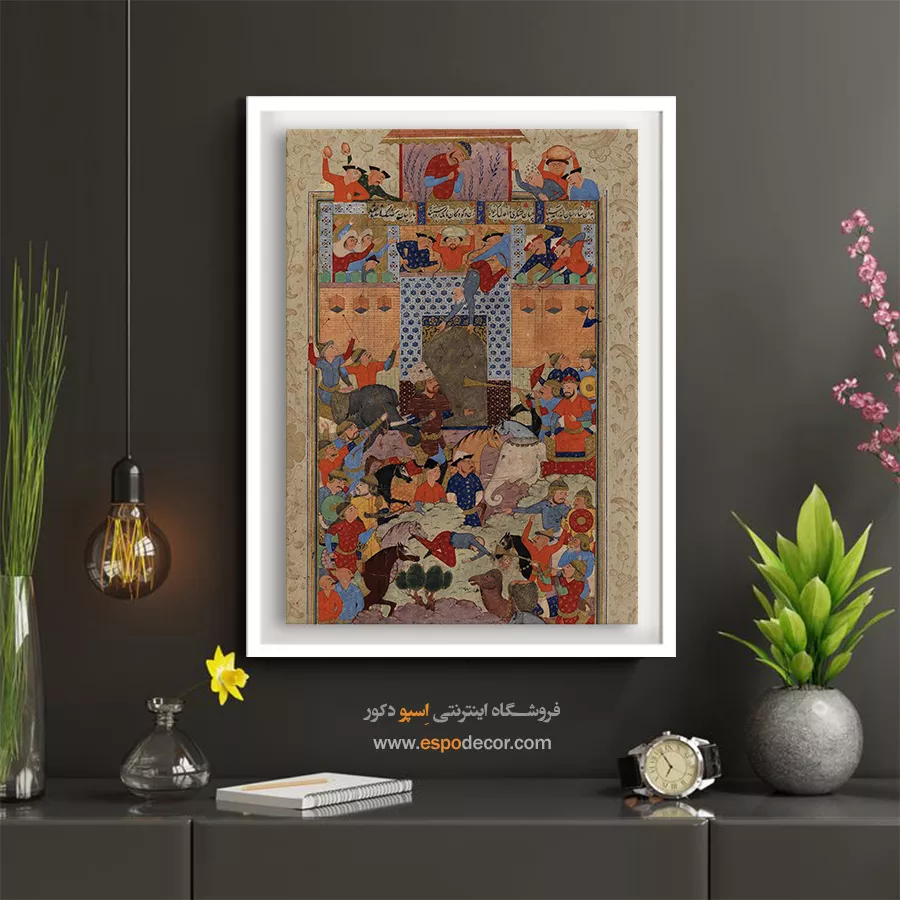 در دل هر نقش و رنگ، قصه‌ای کهن از سرزمین شعر و شکوه نهفته است. این تابلو نقاشی ایرانی برگرفته از اصالت نگارگری و ظرافت مینیاتورهای ماندگار، پلی میان تاریخ و دنیای امروز می‌سازد؛ گویی پنجره‌ای است به جهانی که در آن زیبایی و معنویت هم‌نشین‌اند. هر تابلو، برگ زرینی از نسخ خطی و هنر سنتی ایرانی است؛ سرشار از لطافت خطوط و رنگ‌هایی که به آرامی با چشم و دل سخن می‌گویند. با تماشای آن، می‌توان به عمق فرهنگ ایرانی سفر کرد و لمس کرد که چگونه گذر قرن‌ها نتوانسته فروغ این هنر جاودان را خاموش سازد. این تابلوها بر روی بوم‌های باکیفیت چاپ می‌شوند؛ بافت لطیف بوم و رنگ‌های زنده، جلوه‌ای طبیعی و هنری به اثر می‌بخشند. رنگ‌ها به گونه‌ای انتخاب شده‌اند که درخشان، ماندگار و مقاوم در برابر نور باشند؛ تا سالیان سال، زیبایی اصیل ایرانی در فضای خانه یا محل کارتان بدرخشد. فریم‌های محکم، ساختاری استوار به تابلو می‌بخشند و با طراحی ظریف خود، بر شکوه اثر می‌افزایند. سبک بودن تابلو و امکان نصب آسان، آن را برای هر نوع دکوراسیون مدرن یا کلاسیک مناسب می‌سازد. از اتاق نشیمن تا دفتر کار، این آثار همچون نگینی فاخر بر دیوار خواهند درخشید. هر اثر، فرصتی برای لمس دوباره‌ی هنر نگارگری و مینیاتور ایرانی است؛ هنری که در جزئی‌ترین خطوط، روح شاعرانه ایرانیان را بازمی‌تاباند. این تابلوها نه تنها تزیینی، بلکه یادآور هویت فرهنگی و زیبایی بی‌زمان ایران‌زمین‌اند. اگر به دنبال هدیه‌ای ماندگار یا اثری منحصر به فرد برای فضای زندگی‌تان هستید، این تابلو بوم نگارگری ایرانی انتخابی بی‌همتاست. ترکیب اصالت تاریخی با کیفیت مدرن چاپ، ارزش هنری و زیبایی را در یک قاب جاودانه به شما تقدیم می‌کند.