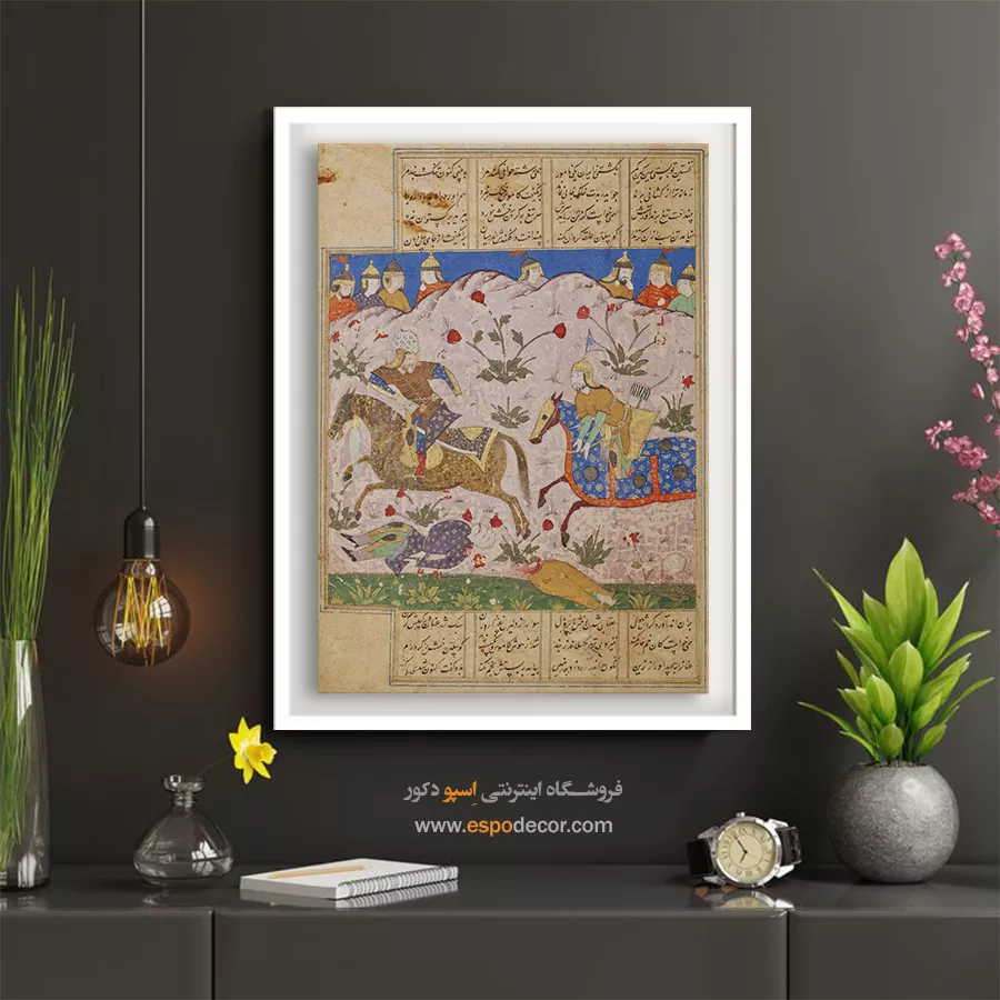 در دل هر نقش و رنگ، قصه‌ای کهن از سرزمین شعر و شکوه نهفته است. این تابلو نقاشی ایرانی برگرفته از اصالت نگارگری و ظرافت مینیاتورهای ماندگار، پلی میان تاریخ و دنیای امروز می‌سازد؛ گویی پنجره‌ای است به جهانی که در آن زیبایی و معنویت هم‌نشین‌اند. هر تابلو، برگ زرینی از نسخ خطی و هنر سنتی ایرانی است؛ سرشار از لطافت خطوط و رنگ‌هایی که به آرامی با چشم و دل سخن می‌گویند. با تماشای آن، می‌توان به عمق فرهنگ ایرانی سفر کرد و لمس کرد که چگونه گذر قرن‌ها نتوانسته فروغ این هنر جاودان را خاموش سازد. این تابلوها بر روی بوم‌های باکیفیت چاپ می‌شوند؛ بافت لطیف بوم و رنگ‌های زنده، جلوه‌ای طبیعی و هنری به اثر می‌بخشند. رنگ‌ها به گونه‌ای انتخاب شده‌اند که درخشان، ماندگار و مقاوم در برابر نور باشند؛ تا سالیان سال، زیبایی اصیل ایرانی در فضای خانه یا محل کارتان بدرخشد. فریم‌های محکم، ساختاری استوار به تابلو می‌بخشند و با طراحی ظریف خود، بر شکوه اثر می‌افزایند. سبک بودن تابلو و امکان نصب آسان، آن را برای هر نوع دکوراسیون مدرن یا کلاسیک مناسب می‌سازد. از اتاق نشیمن تا دفتر کار، این آثار همچون نگینی فاخر بر دیوار خواهند درخشید. هر اثر، فرصتی برای لمس دوباره‌ی هنر نگارگری و مینیاتور ایرانی است؛ هنری که در جزئی‌ترین خطوط، روح شاعرانه ایرانیان را بازمی‌تاباند. این تابلوها نه تنها تزیینی، بلکه یادآور هویت فرهنگی و زیبایی بی‌زمان ایران‌زمین‌اند. اگر به دنبال هدیه‌ای ماندگار یا اثری منحصر به فرد برای فضای زندگی‌تان هستید، این تابلو بوم نگارگری ایرانی انتخابی بی‌همتاست. ترکیب اصالت تاریخی با کیفیت مدرن چاپ، ارزش هنری و زیبایی را در یک قاب جاودانه به شما تقدیم می‌کند.
