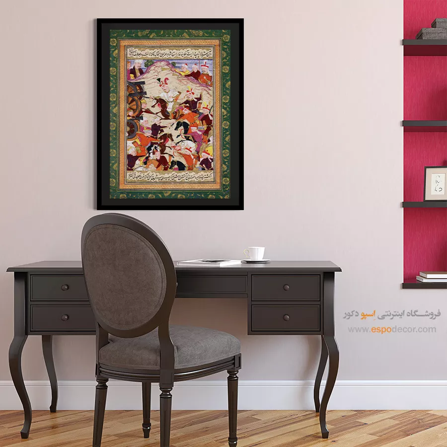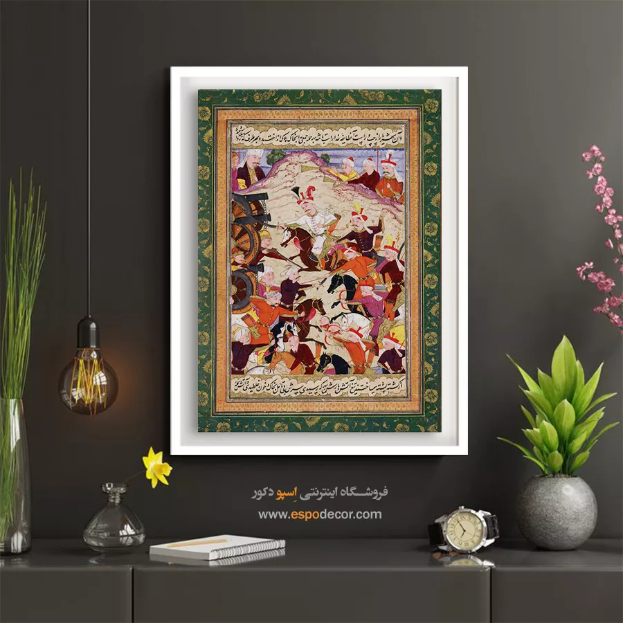 در ظرافت خطوط و درخشش رنگها، روایت هزارساله هنر مینیاتور و نگارگری ایرانی زنده میشود. این تابلو نقاشی ایرانی، یادگاری فاخر از میراث فرهنگی ایران برای خانهای آراسته و روحنواز است.