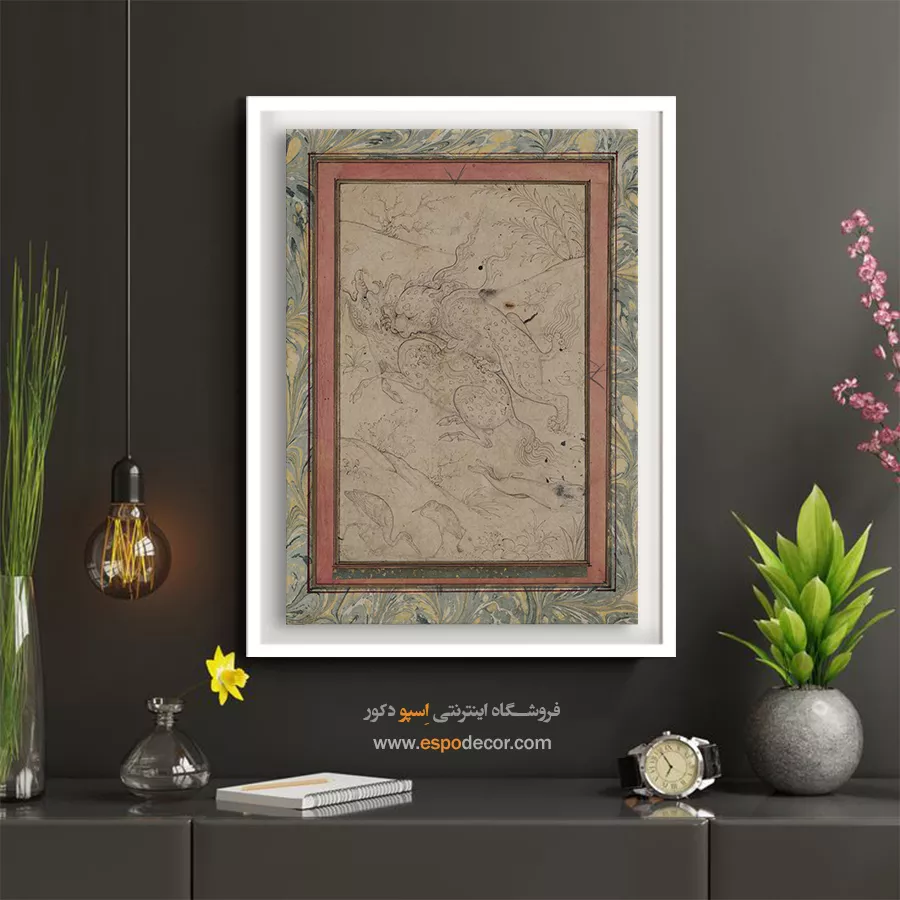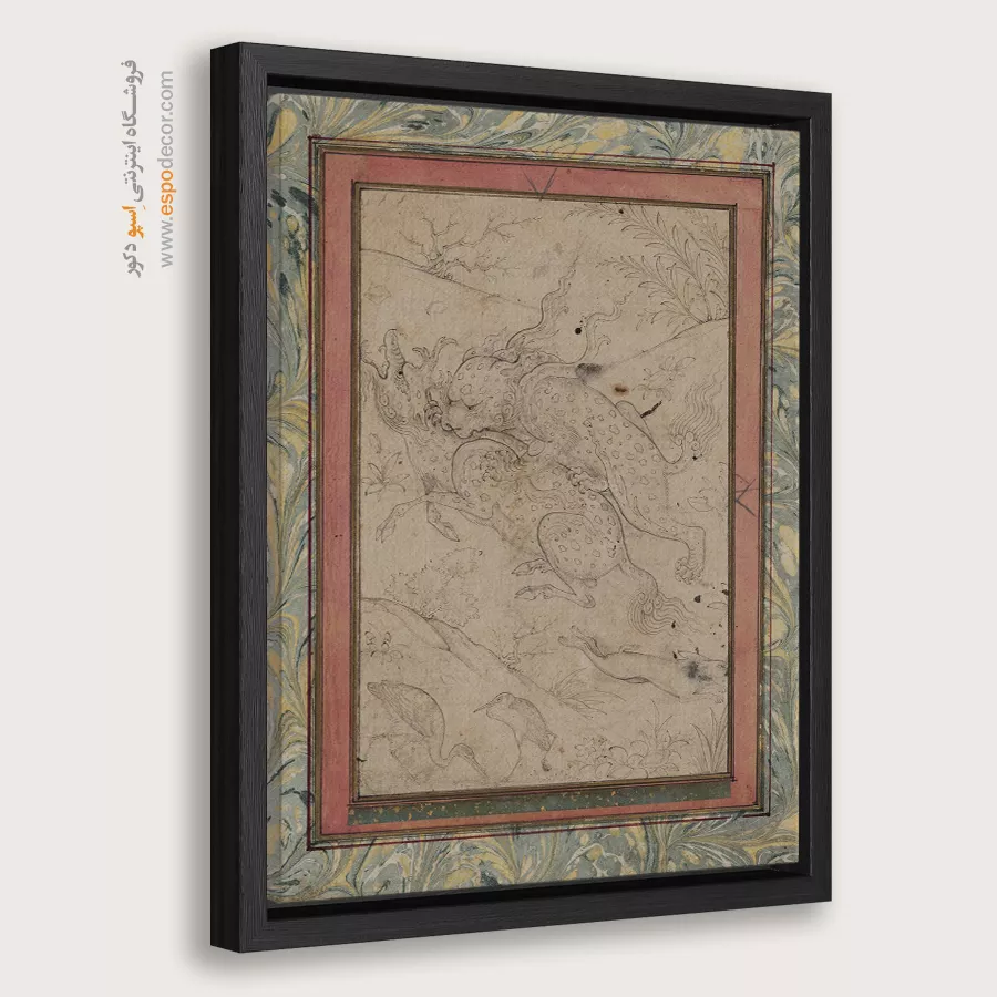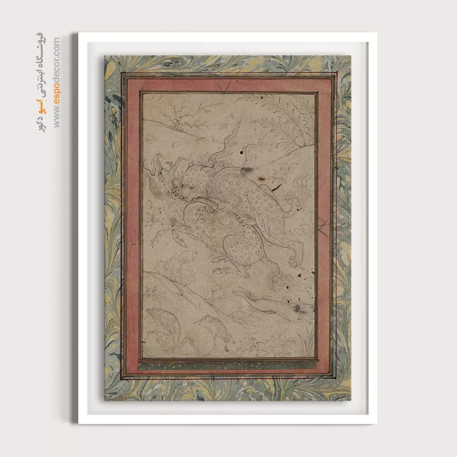 یک شیر در حال پریدن روی کیلین – تابلو نقاشی ایرانی