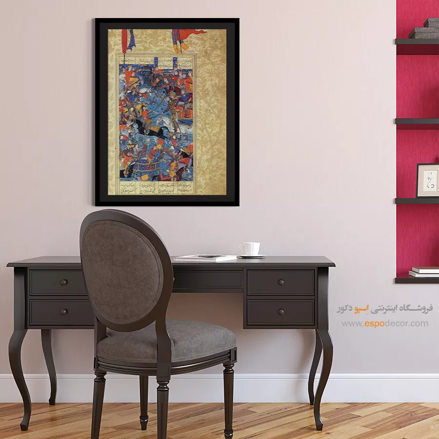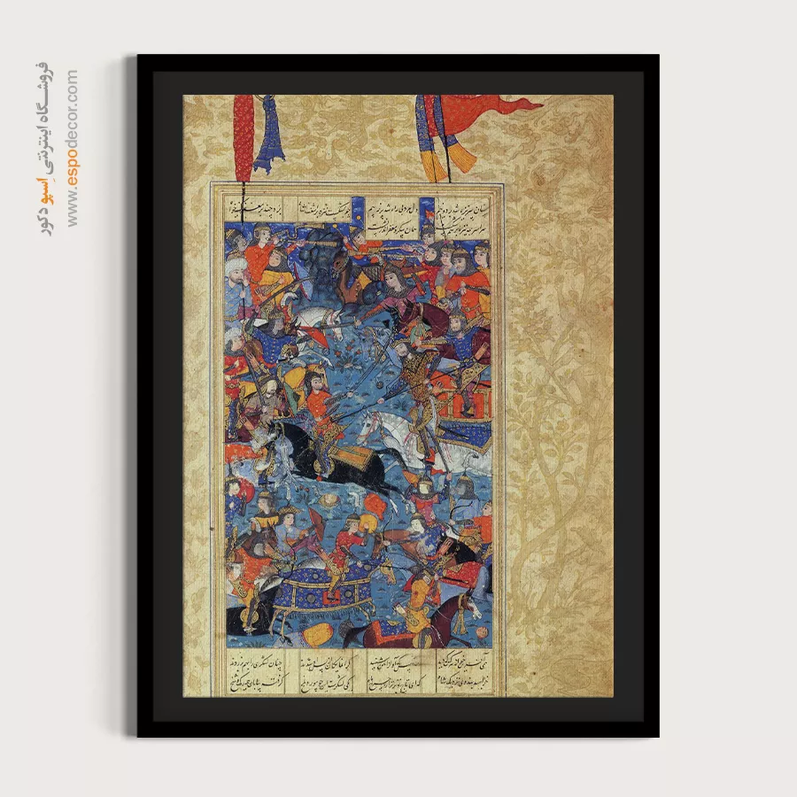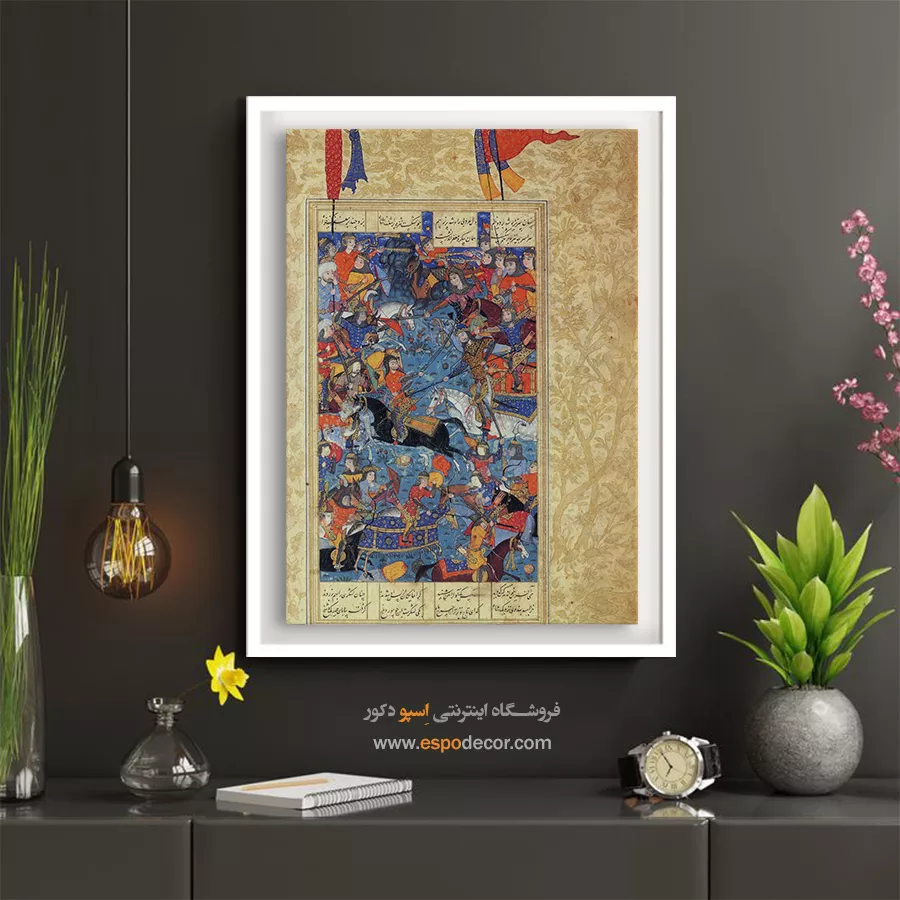 در دل هر نقش و رنگ، قصه‌ای کهن از سرزمین شعر و شکوه نهفته است. این تابلو نقاشی ایرانی برگرفته از اصالت نگارگری و ظرافت مینیاتورهای ماندگار، پلی میان تاریخ و دنیای امروز می‌سازد؛ گویی پنجره‌ای است به جهانی که در آن زیبایی و معنویت هم‌نشین‌اند.هر تابلو، برگ زرینی از نسخ خطی و هنر سنتی ایرانی است؛ سرشار از لطافت خطوط و رنگ‌هایی که به آرامی با چشم و دل سخن می‌گویند. با تماشای آن، می‌توان به عمق فرهنگ ایرانی سفر کرد و لمس کرد که چگونه گذر قرن‌ها نتوانسته فروغ این هنر جاودان را خاموش سازد.این تابلوها بر روی بوم‌های باکیفیت چاپ می‌شوند؛ بافت لطیف بوم و رنگ‌های زنده، جلوه‌ای طبیعی و هنری به اثر می‌بخشند. رنگ‌ها به گونه‌ای انتخاب شده‌اند که درخشان، ماندگار و مقاوم در برابر نور باشند؛ تا سالیان سال، زیبایی اصیل ایرانی در فضای خانه یا محل کارتان بدرخشد.فریم‌های محکم، ساختاری استوار به تابلو می‌بخشند و با طراحی ظریف خود، بر شکوه اثر می‌افزایند. سبک بودن تابلو و امکان نصب آسان، آن را برای هر نوع دکوراسیون مدرن یا کلاسیک مناسب می‌سازد. از اتاق نشیمن تا دفتر کار، این آثار همچون نگینی فاخر بر دیوار خواهند درخشید.هر اثر، فرصتی برای لمس دوباره‌ی هنر نگارگری و مینیاتور ایرانی است؛ هنری که در جزئی‌ترین خطوط، روح شاعرانه ایرانیان را بازمی‌تاباند. این تابلوها نه تنها تزیینی، بلکه یادآور هویت فرهنگی و زیبایی بی‌زمان ایران‌زمین‌اند.اگر به دنبال هدیه‌ای ماندگار یا اثری منحصر به فرد برای فضای زندگی‌تان هستید، این تابلو بوم نگارگری ایرانی انتخابی بی‌همتاست. ترکیب اصالت تاریخی با کیفیت مدرن چاپ، ارزش هنری و زیبایی را در یک قاب جاودانه به شما تقدیم می‌کند.