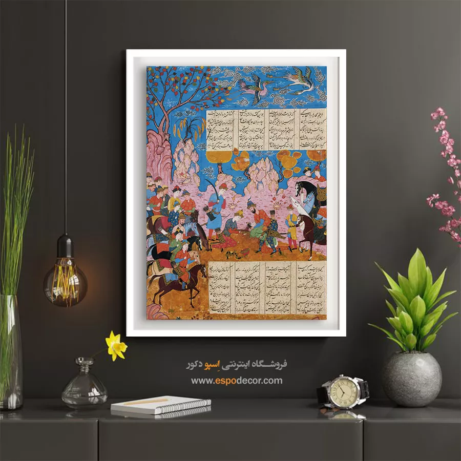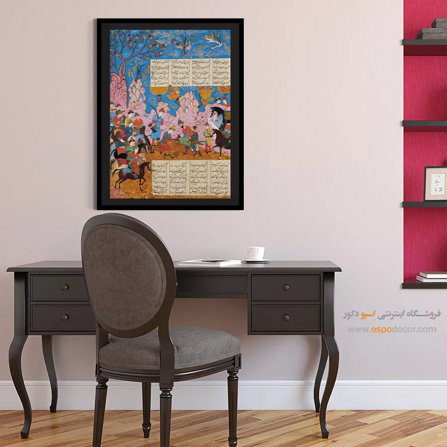 در ظرافت خطوط و درخشش رنگ‌ها، روایت هزارساله هنر مینیاتور و نگارگری ایرانی زنده می‌شود. این تابلو نقاشی ایرانی، یادگاری فاخر از میراث فرهنگی ایران برای خانه‌ای آراسته و روح‌نواز است.
