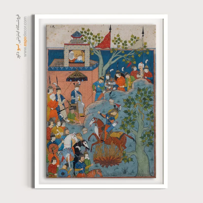 در دل هر نقش و رنگ، قصه‌ای کهن از سرزمین شعر و شکوه نهفته است. این تابلو نقاشی ایرانی برگرفته از اصالت نگارگری و ظرافت مینیاتورهای ماندگار، پلی میان تاریخ و دنیای امروز می‌سازد؛ گویی پنجره‌ای است به جهانی که در آن زیبایی و معنویت هم‌نشین‌اند.هر تابلو، برگ زرینی از نسخ خطی و هنر سنتی ایرانی است؛ سرشار از لطافت خطوط و رنگ‌هایی که به آرامی با چشم و دل سخن می‌گویند. با تماشای آن، می‌توان به عمق فرهنگ ایرانی سفر کرد و لمس کرد که چگونه گذر قرن‌ها نتوانسته فروغ این هنر جاودان را خاموش سازد.این تابلوها بر روی بوم‌های باکیفیت چاپ می‌شوند؛ بافت لطیف بوم و رنگ‌های زنده، جلوه‌ای طبیعی و هنری به اثر می‌بخشند. رنگ‌ها به گونه‌ای انتخاب شده‌اند که درخشان، ماندگار و مقاوم در برابر نور باشند؛ تا سالیان سال، زیبایی اصیل ایرانی در فضای خانه یا محل کارتان بدرخشد.فریم‌های محکم، ساختاری استوار به تابلو می‌بخشند و با طراحی ظریف خود، بر شکوه اثر می‌افزایند. سبک بودن تابلو و امکان نصب آسان، آن را برای هر نوع دکوراسیون مدرن یا کلاسیک مناسب می‌سازد. از اتاق نشیمن تا دفتر کار، این آثار همچون نگینی فاخر بر دیوار خواهند درخشید.هر اثر، فرصتی برای لمس دوباره‌ی هنر نگارگری و مینیاتور ایرانی است؛ هنری که در جزئی‌ترین خطوط، روح شاعرانه ایرانیان را بازمی‌تاباند. این تابلوها نه تنها تزیینی، بلکه یادآور هویت فرهنگی و زیبایی بی‌زمان ایران‌زمین‌اند.اگر به دنبال هدیه‌ای ماندگار یا اثری منحصر به فرد برای فضای زندگی‌تان هستید، این تابلو بوم نگارگری ایرانی انتخابی بی‌همتاست. ترکیب اصالت تاریخی با کیفیت مدرن چاپ، ارزش هنری و زیبایی را در یک قاب جاودانه به شما تقدیم می‌کند.