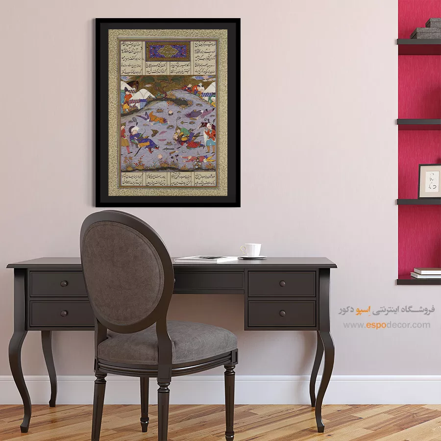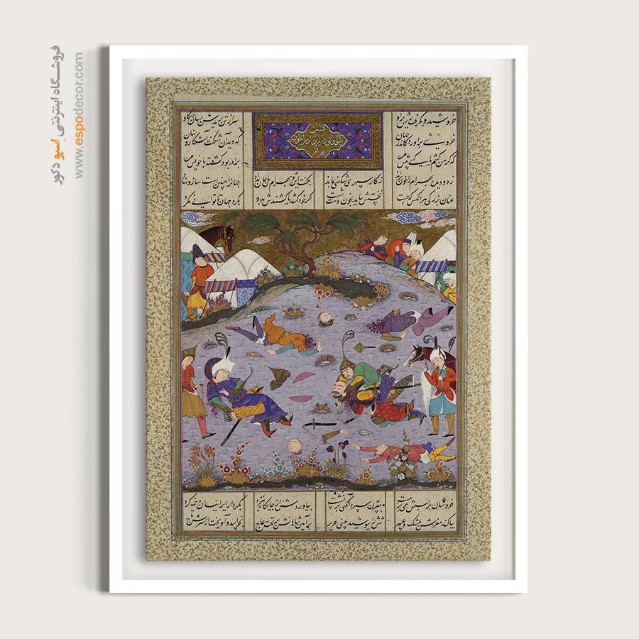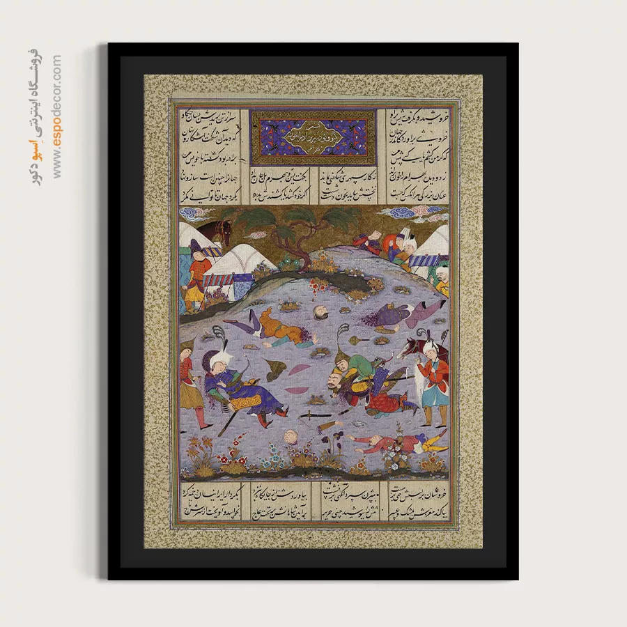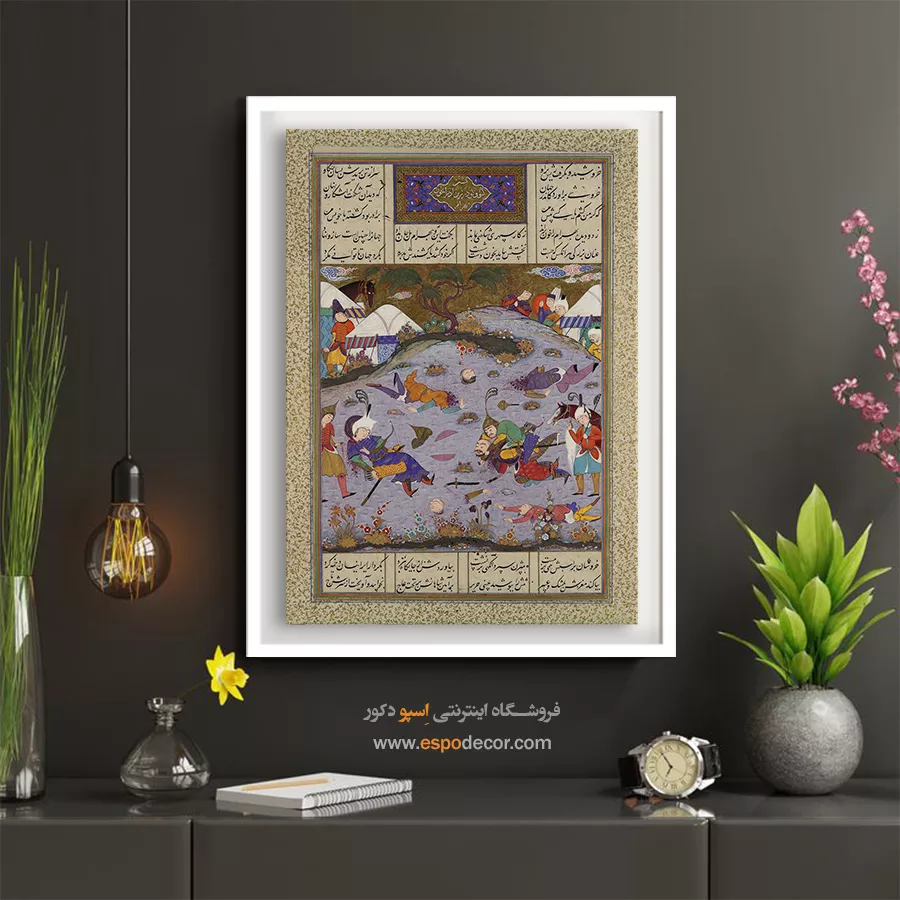در دل هر نقش و رنگ، قصه‌ای کهن از سرزمین شعر و شکوه نهفته است. این تابلو نقاشی ایرانی برگرفته از اصالت نگارگری و ظرافت مینیاتورهای ماندگار، پلی میان تاریخ و دنیای امروز می‌سازد؛ گویی پنجره‌ای است به جهانی که در آن زیبایی و معنویت هم‌نشین‌اند.هر تابلو، برگ زرینی از نسخ خطی و هنر سنتی ایرانی است؛ سرشار از لطافت خطوط و رنگ‌هایی که به آرامی با چشم و دل سخن می‌گویند. با تماشای آن، می‌توان به عمق فرهنگ ایرانی سفر کرد و لمس کرد که چگونه گذر قرن‌ها نتوانسته فروغ این هنر جاودان را خاموش سازد.این تابلوها بر روی بوم‌های باکیفیت چاپ می‌شوند؛ بافت لطیف بوم و رنگ‌های زنده، جلوه‌ای طبیعی و هنری به اثر می‌بخشند. رنگ‌ها به گونه‌ای انتخاب شده‌اند که درخشان، ماندگار و مقاوم در برابر نور باشند؛ تا سالیان سال، زیبایی اصیل ایرانی در فضای خانه یا محل کارتان بدرخشد.فریم‌های محکم، ساختاری استوار به تابلو می‌بخشند و با طراحی ظریف خود، بر شکوه اثر می‌افزایند. سبک بودن تابلو و امکان نصب آسان، آن را برای هر نوع دکوراسیون مدرن یا کلاسیک مناسب می‌سازد. از اتاق نشیمن تا دفتر کار، این آثار همچون نگینی فاخر بر دیوار خواهند درخشید.هر اثر، فرصتی برای لمس دوباره‌ی هنر نگارگری و مینیاتور ایرانی است؛ هنری که در جزئی‌ترین خطوط، روح شاعرانه ایرانیان را بازمی‌تاباند. این تابلوها نه تنها تزیینی، بلکه یادآور هویت فرهنگی و زیبایی بی‌زمان ایران‌زمین‌اند.اگر به دنبال هدیه‌ای ماندگار یا اثری منحصر به فرد برای فضای زندگی‌تان هستید، این تابلو بوم نگارگری ایرانی انتخابی بی‌همتاست. ترکیب اصالت تاریخی با کیفیت مدرن چاپ، ارزش هنری و زیبایی را در یک قاب جاودانه به شما تقدیم می‌کند.