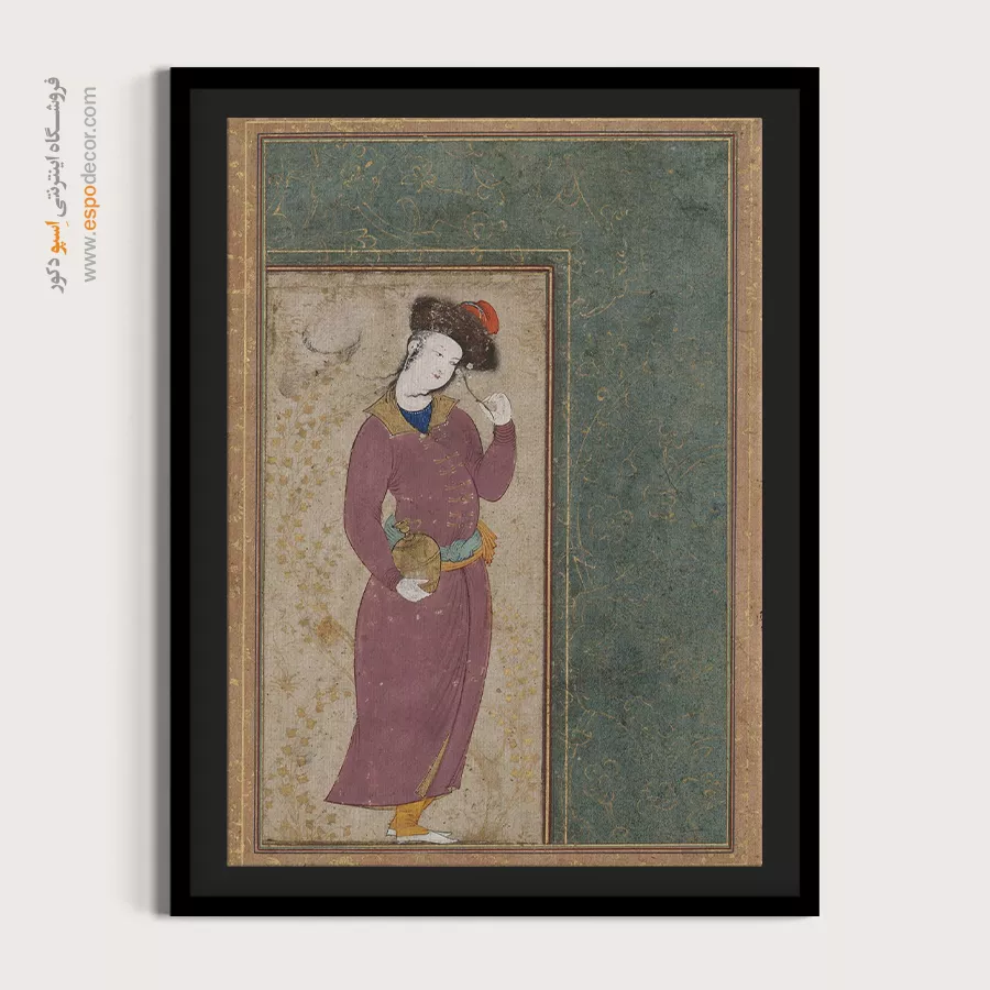 جوانی که گل و بطری در دست دارد – تابلو نقاشی ایرانی
