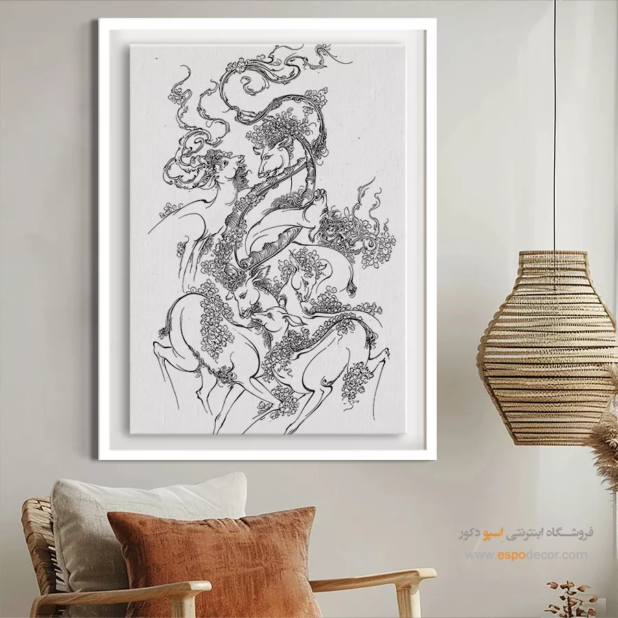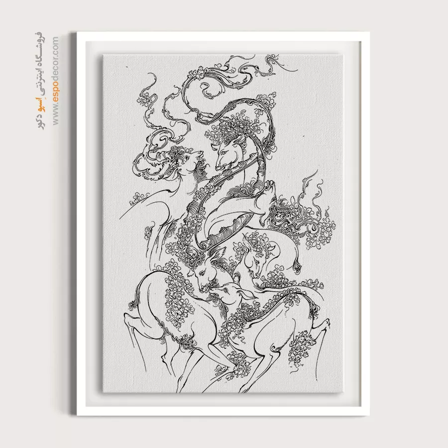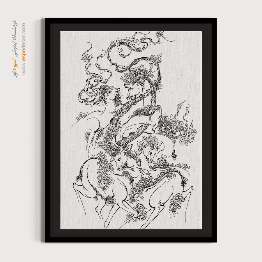 تابلو مینیاتور خطی با طراحی سیاه و سفید و سبک سنتی ایرانی، انتخابی خاص برای دکوراسیون کلاسیک و مینیمال است. این تابلو با قاب مینیمال، جلوهای آرامشبخش به دیوارهای خانه یا محل کار شما میبخشد.