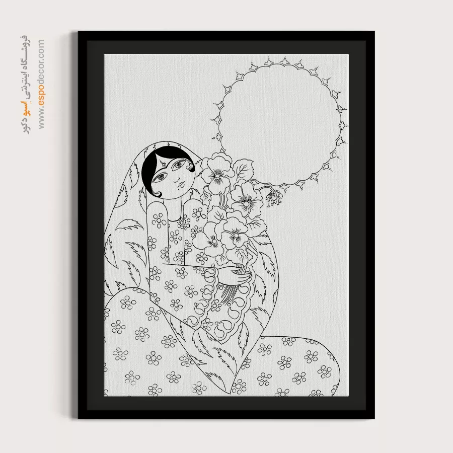 تابلو مینیاتور خطی با طراحی سیاه و سفید و سبک سنتی ایرانی، انتخابی خاص برای دکوراسیون کلاسیک و مینیمال است. این تابلو با قاب مینیمال، جلوه‌ای آرامش‌بخش به دیوارهای خانه یا محل کار شما می‌بخشد.
