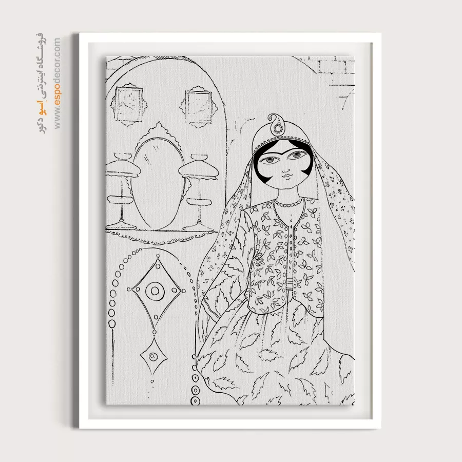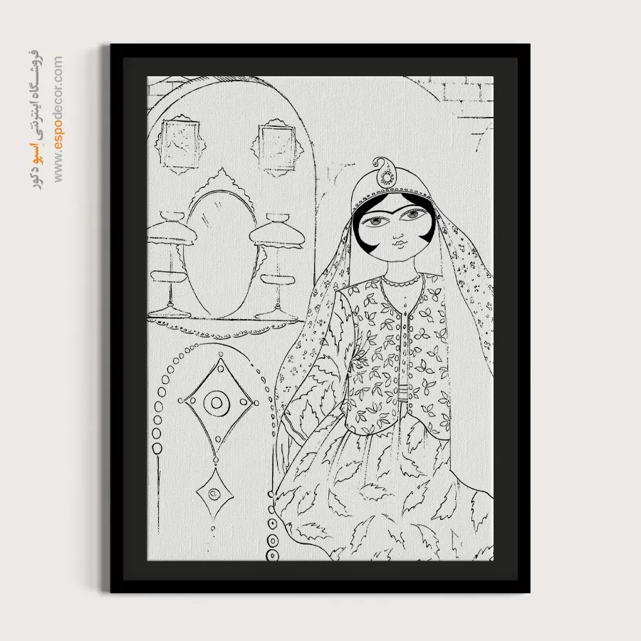 تابلو مینیاتور خطی با طراحی سیاه و سفید و سبک سنتی ایرانی، انتخابی خاص برای دکوراسیون کلاسیک و مینیمال است. این تابلو با قاب مینیمال، جلوه‌ای آرامش‌بخش به دیوارهای خانه یا محل کار شما می‌بخشد.