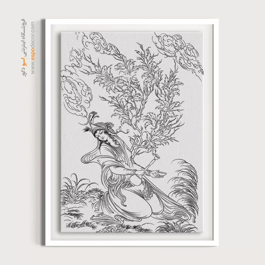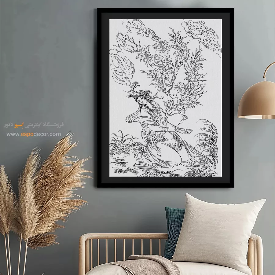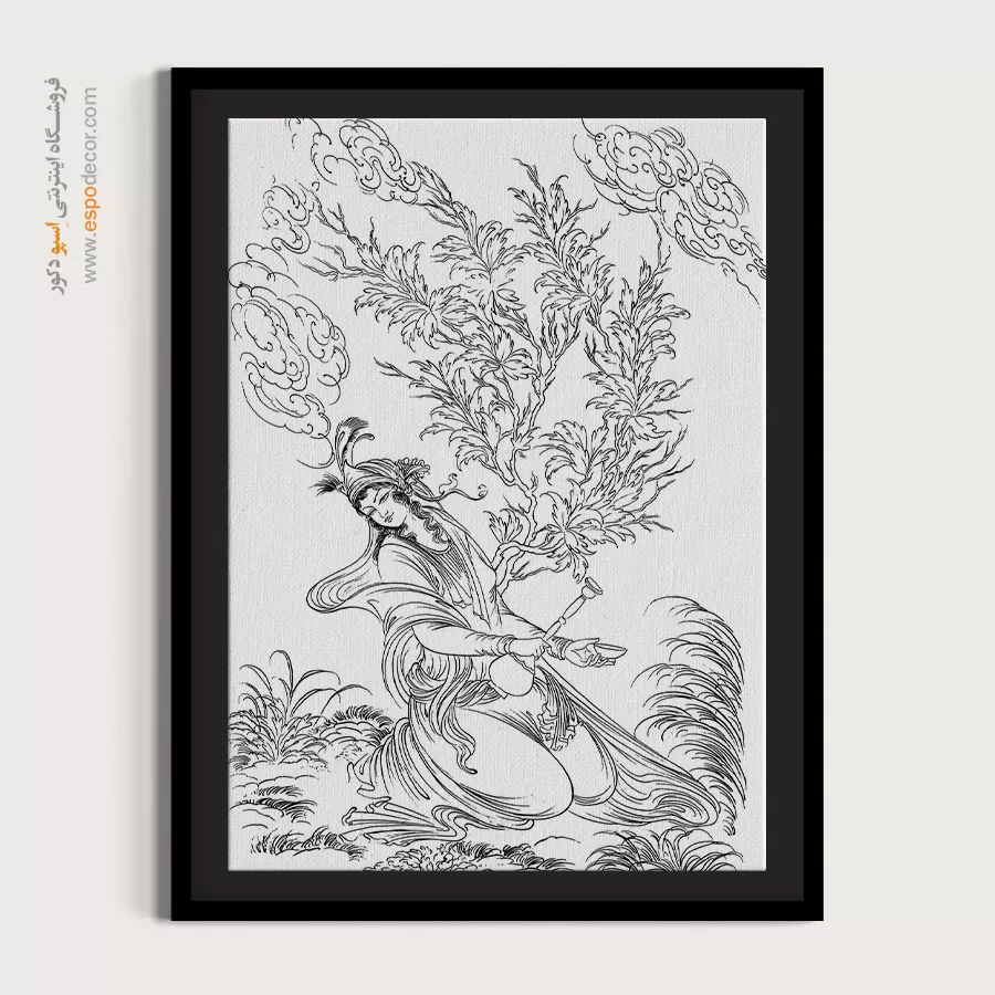 تابلو مینیاتور خطی با طراحی سیاه و سفید و سبک سنتی ایرانی، انتخابی خاص برای دکوراسیون کلاسیک و مینیمال است. این تابلو با قاب مینیمال، جلوه‌ای آرامش‌بخش به دیوارهای خانه یا محل کار شما می‌بخشد.