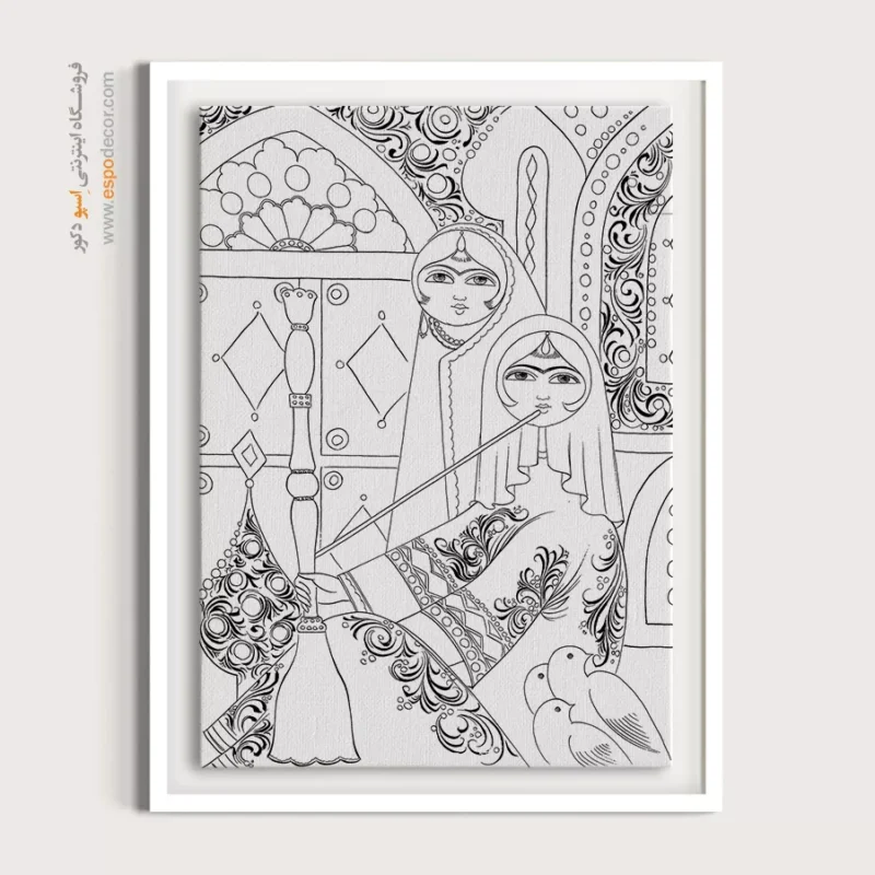 تابلو مینیاتور خطی با طراحی سیاه و سفید و سبک سنتی ایرانی، انتخابی خاص برای دکوراسیون کلاسیک و مینیمال است. این تابلو با قاب مینیمال، جلوهای آرامشبخش به دیوارهای خانه یا محل کار شما میبخشد.